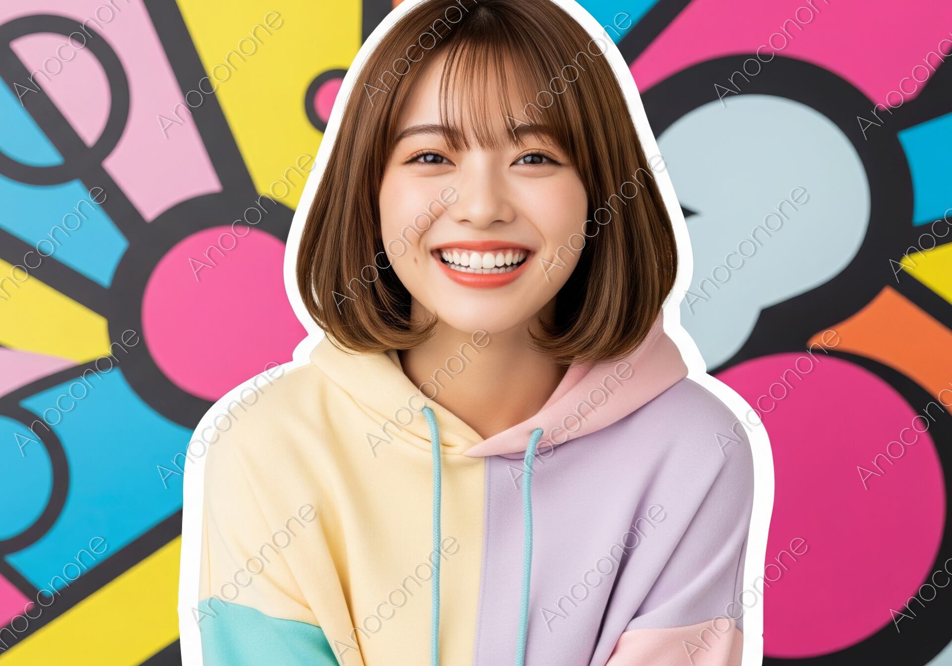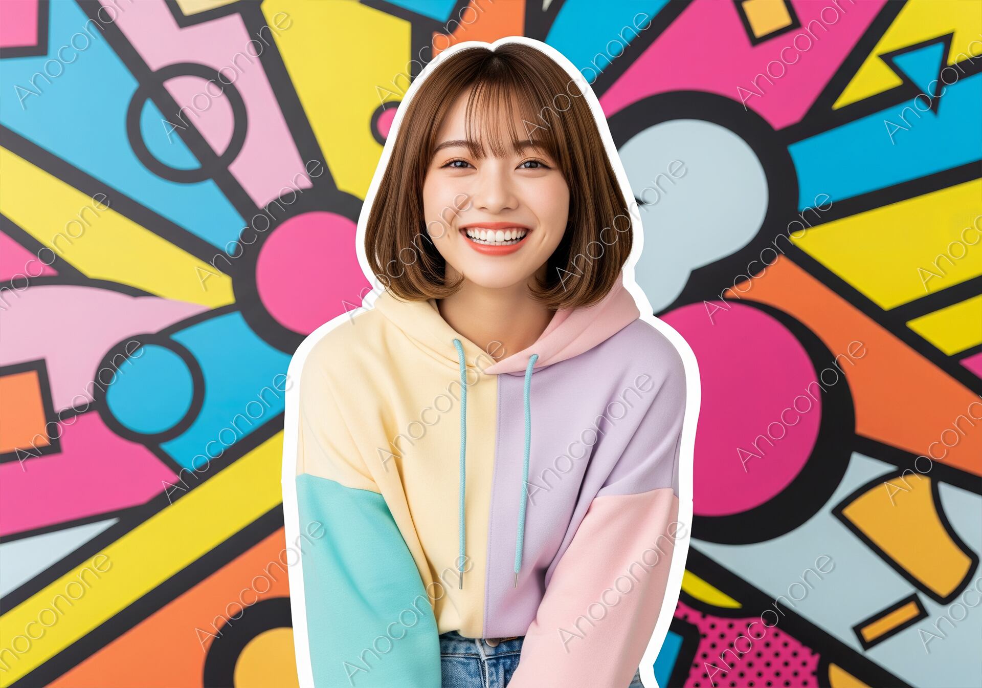鮮やかな色彩のポップアート風の背景の前で、パステルカラーの切り替えデザインが特徴のパーカーを着用した女性が、満面の笑顔でカメラに微笑んでいます。エネルギッシュな背景と、彼女の屈託のない表情が、若々しく、クリエイティブなライフスタイルを表現しています。ファッション、アート、ライフスタイル、ポジティブなイメージを求める広告やウェブコンテンツに最適な一枚です。