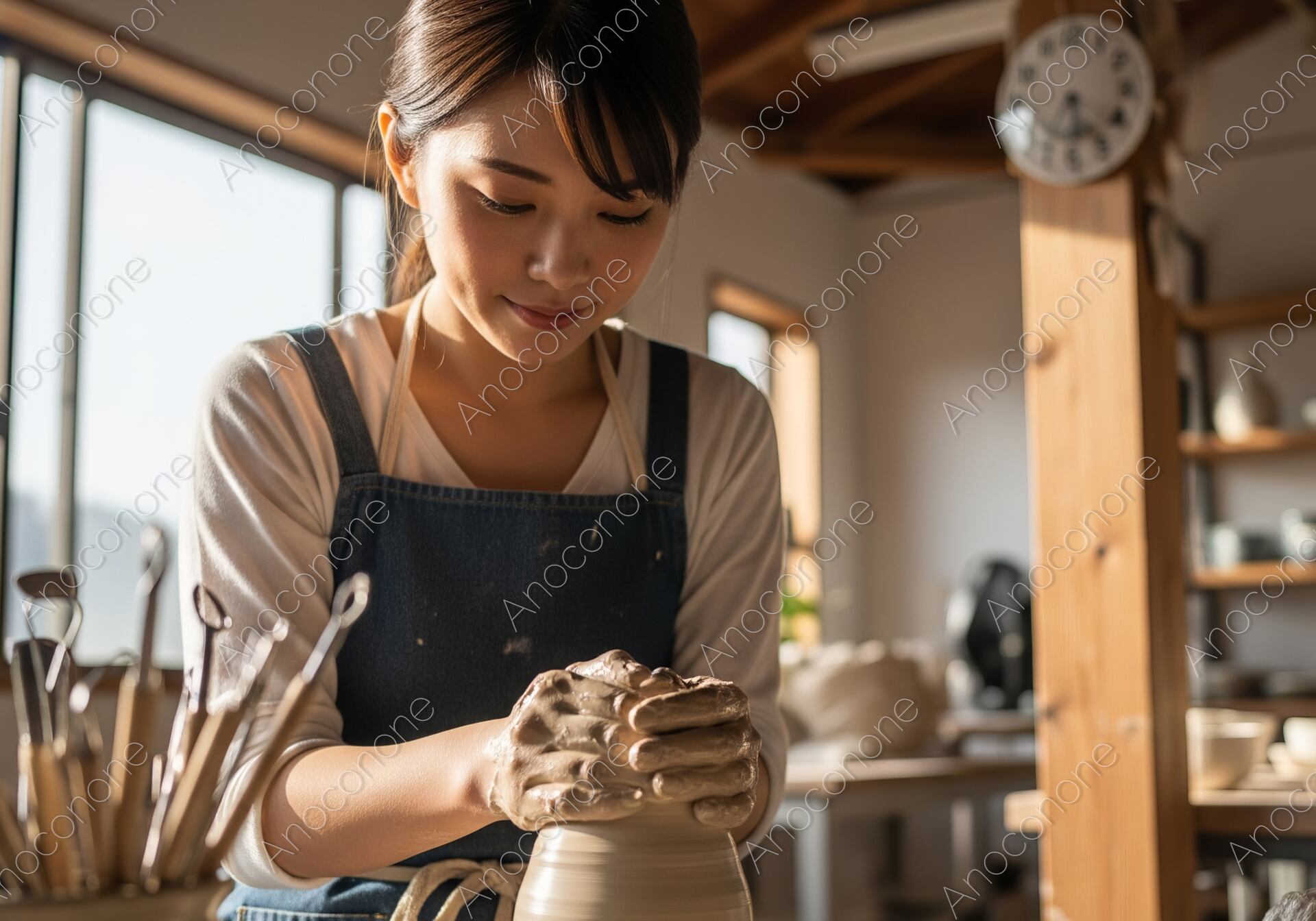 画像素材:木の梁が露出した開放的な工房で、電動ろくろを使い粘土を成形している人の姿を捉えています。デニムのエプロンを着用し、真剣ながらも穏やかな表情で作業に打ち込む様子からは、手仕事を通じて自分自身と向き合う豊かな時間が伝わってきます。工房内には制作途中の作品を並べた棚や、使い込まれた道具類が整然と置かれ、本格的な創作の場であることを感じさせます。窓から差し込む明るい光が、濡れた粘土の質感や、集中して動く指先を美しく照らし出しています。全体的に落ち着いたナチュラルなトーンで構成されており、見る人に心地よい静寂と、ものづくりの楽しさを抱かせる一枚です。大人の趣味としての陶芸教室の案内や、地方移住、スローライフをテーマにしたライフスタイルメディアのアイキャッチに最適な素材です。