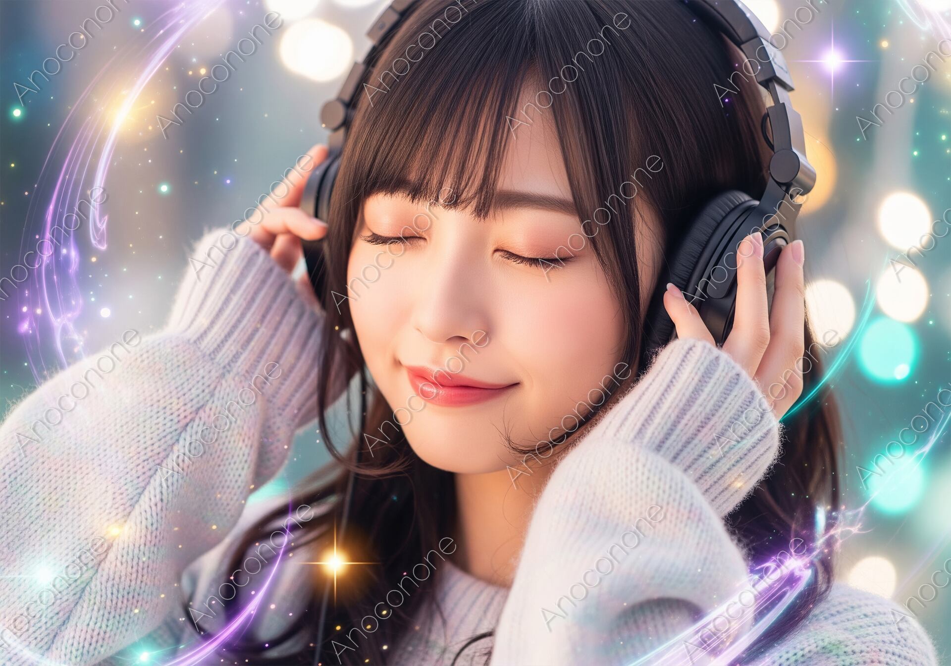 画像素材:高品質なヘッドホンを装着し、うっとりと目を閉じて音楽を愉しむ人の表情を捉えた幻想的な一枚です。周囲には宝石のように煌めくボケ光や、音の広がりを視覚化したような紫とゴールドの光のラインが描かれ、魔法のような没入感を演出しています。ふんわりとしたパステルカラーのニットを着用し、ヘッドホンにそっと手を添えるポーズが、柔らかで上品な雰囲気を醸し出しています。微笑みを浮かべた口元からは、聴いている音楽への深い満足感が伝わり、見る人を心地よい旋律の世界へと誘います。清潔感のあるライティングと高精細な描写により、まつげのディテールや肌の透明感が際立つ、非常に完成度の高いビジュアルです。音楽配信サービスのメインビジュアル、高級オーディオ機器のプロモーション、または「癒やし」や「感性」をテーマにしたライフスタイルメディアのアイキャッチとして、圧倒的な存在感を放つ素材です。