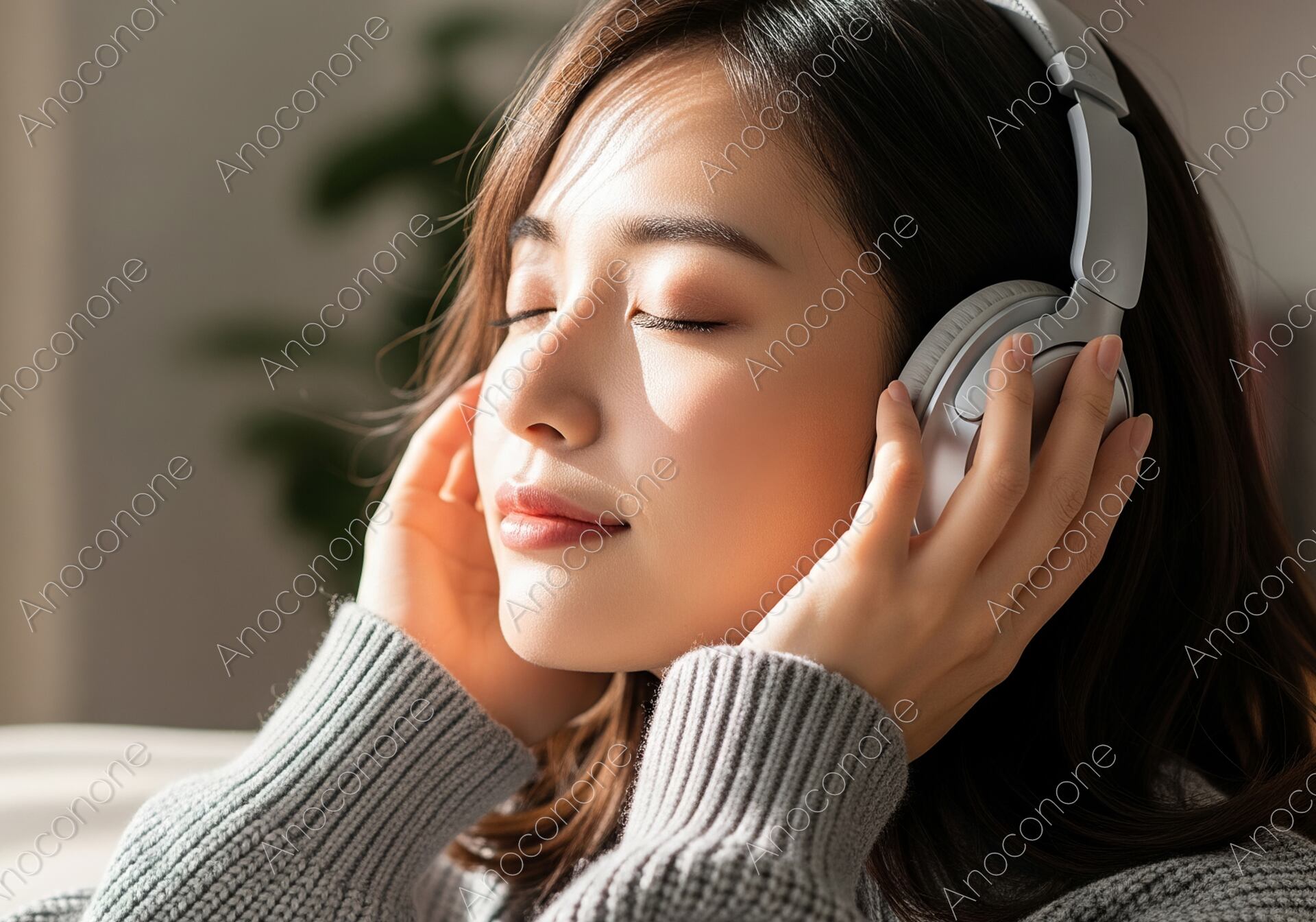 画像素材:オーバーイヤー型のヘッドホンを装着し、静かに目を閉じて音楽の世界に浸る人の横顔を捉えています。窓から差し込む柔らかな自然光が、肌の透明感や髪の繊細な質感を際立たせ、穏やかで上質なリラックスタイムを演出しています。グレーのゆったりとしたニットを着用した姿は、温かみのある「おうち時間」の心地よさを象徴しています。ヘッドホンにそっと手を添え、心ゆくまでサウンドを愉しむ表情からは、日常の喧騒を忘れた深い安らぎが伝わってきます。背景には室内の観葉植物が淡くぼかされており、被写体の存在感を高めるとともに、清潔感のあるナチュラルなライフスタイルを表現しています。オーディオ機器のカタログや、高音質な音楽体験を提案する広告、また「セルフケア」や「集中力向上」をテーマにしたブログ記事のアイキャッチなどに最適な一枚です。