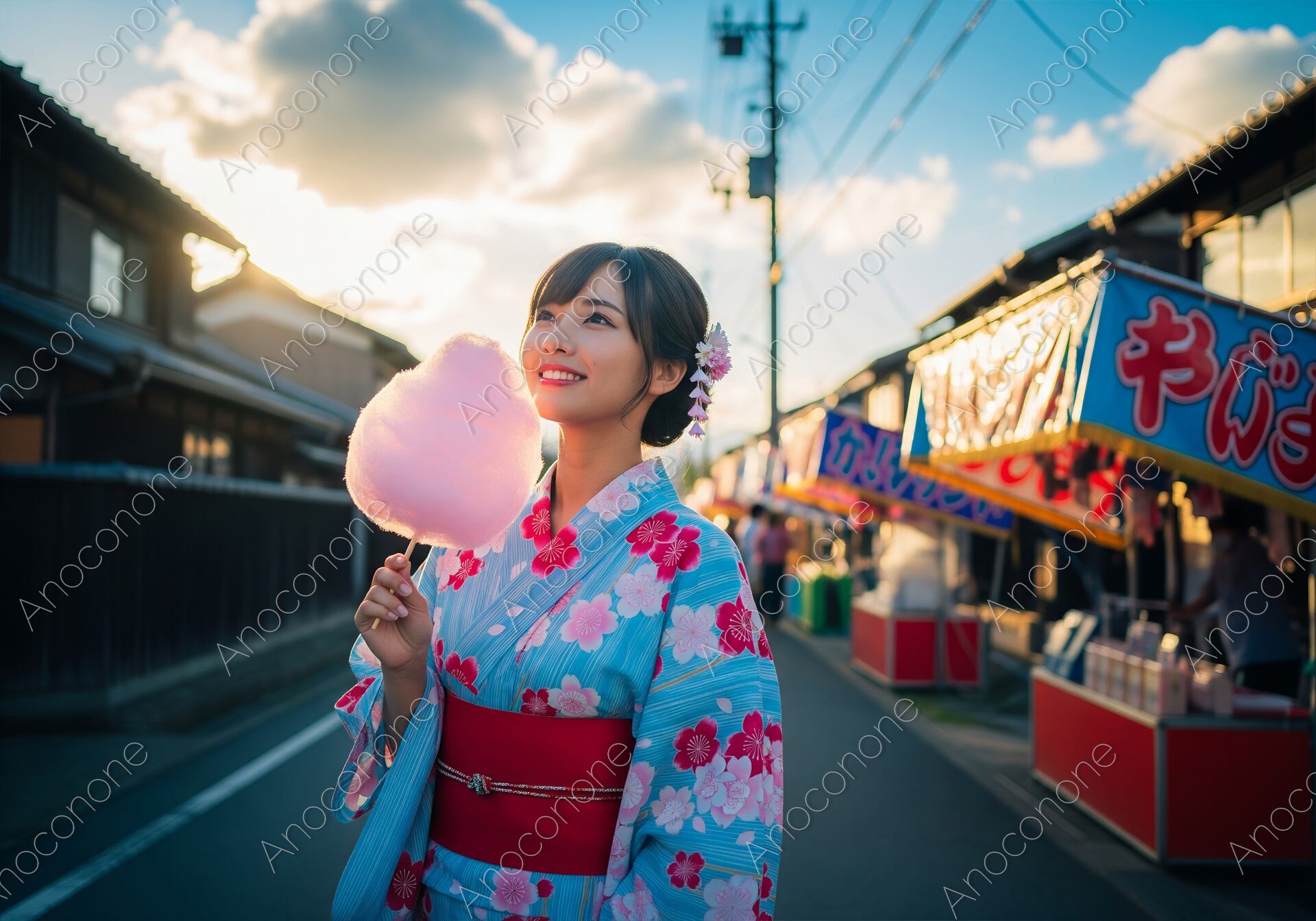 夕焼けの柔らかな光が差し込む日本の伝統的な街並みで、青い花柄の浴衣と赤い帯を身につけた女性が、大きなピンク色の綿あめを手に、空を見上げて明るく微笑んでいます。屋台が並ぶ賑やかな雰囲気と、光を浴びて輝く彼女の表情が、夏祭りならではの楽しいひとときを表現しています。浴衣、夏祭り、綿あめ、日本の文化、ライフスタイルといったテーマの広告やウェブコンテンツに最適な一枚です。