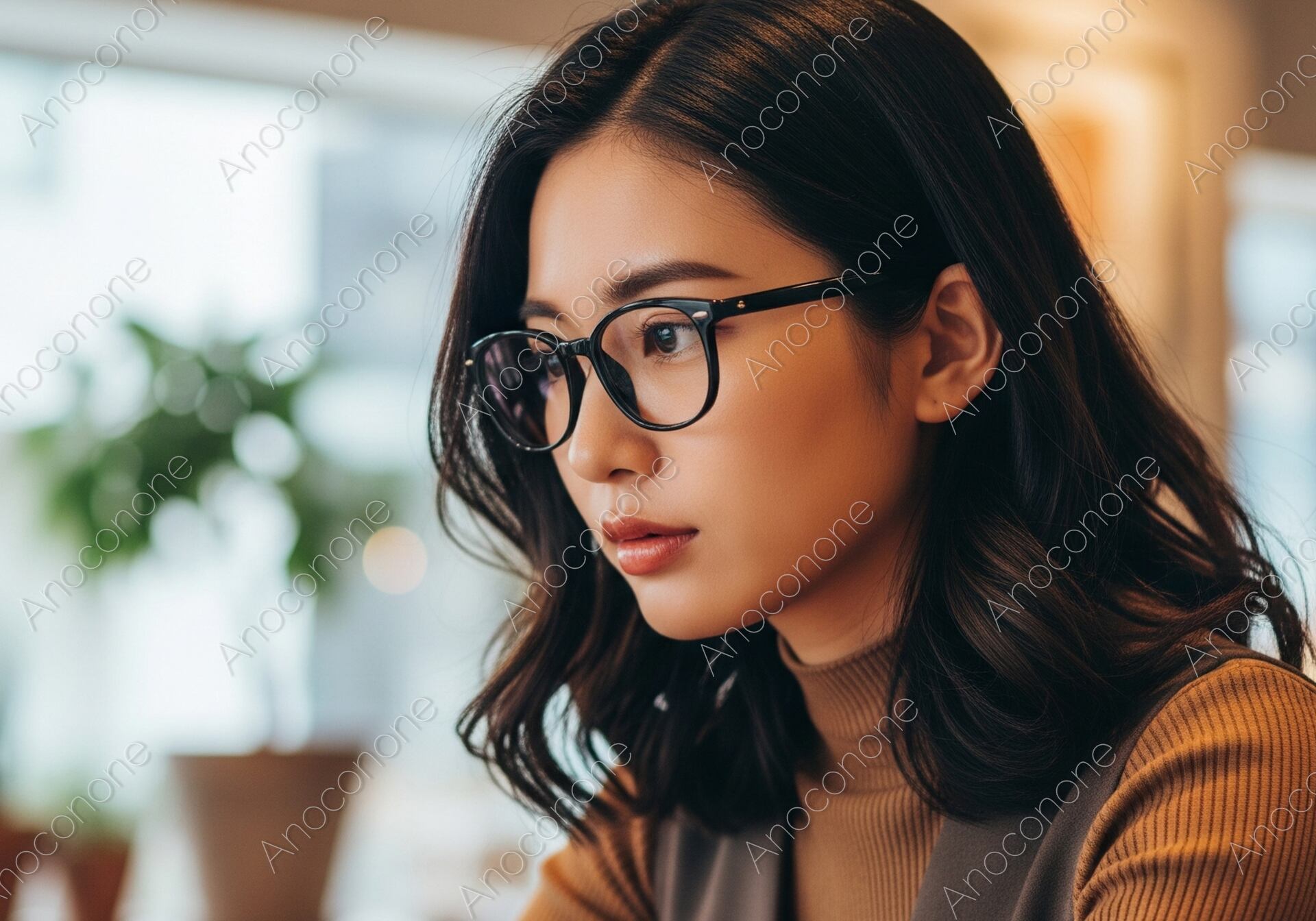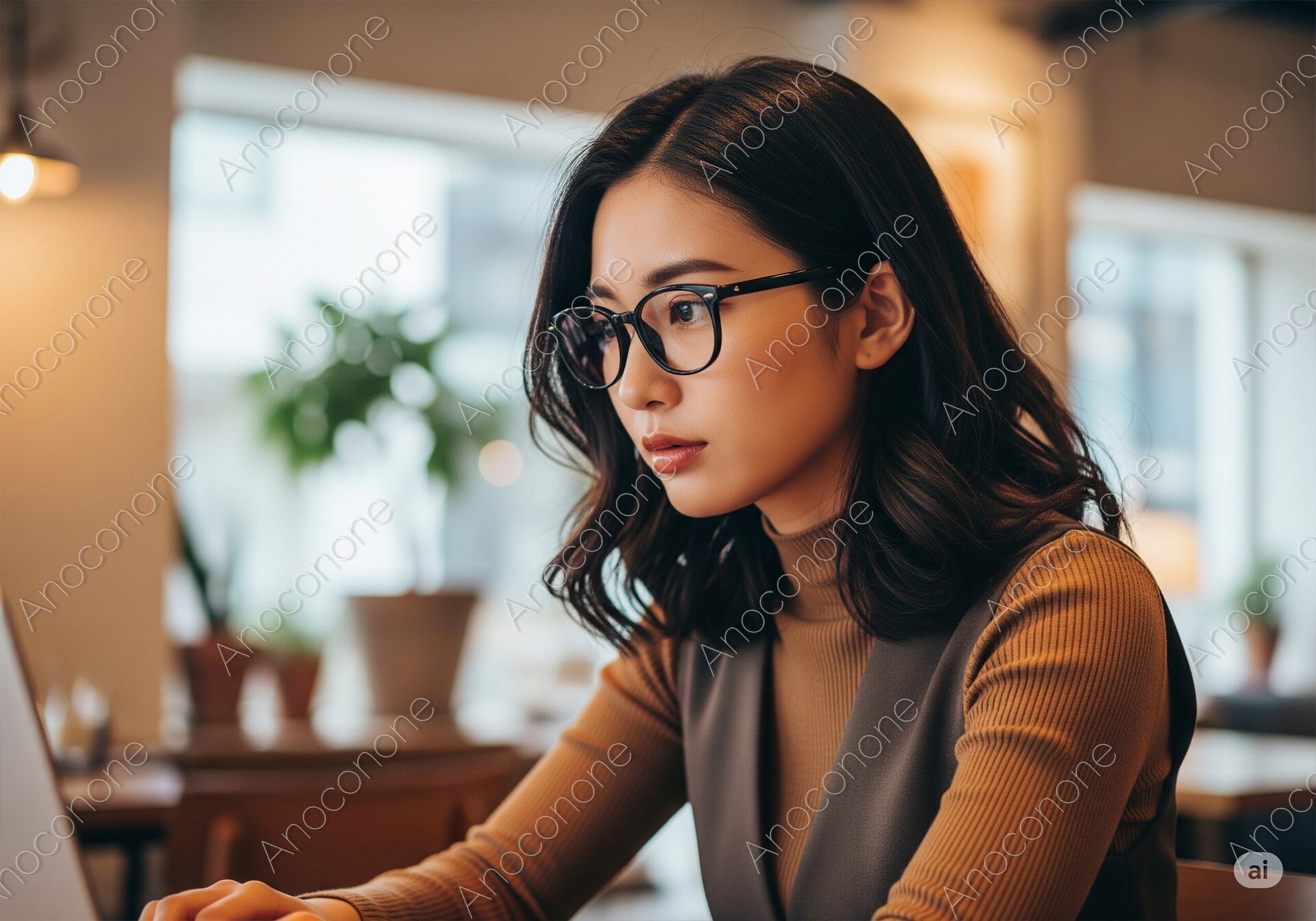温かい照明が灯るカフェで、ライトブラウンのトップスの上にダークカラーのベストを着用し、メガネをかけた女性が、ノートパソコンに向かい集中して作業しています。真剣な眼差しと、落ち着いた表情が、場所を選ばない現代の効率的な働き方を表現しています。リモートワーク、カフェ、仕事、ライフスタイル、知的な活動といったテーマの広告やウェブコンテンツに最適な一枚です。