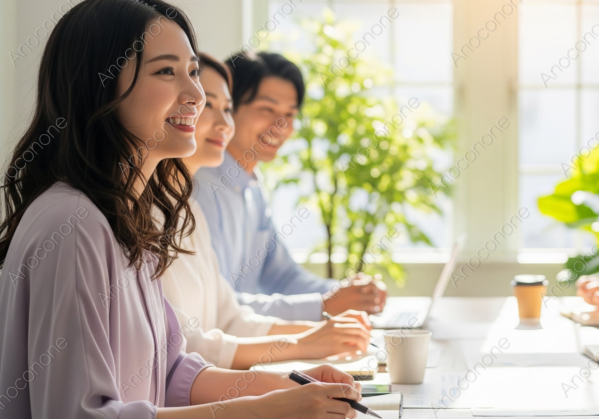自然光が降り注ぐ明るいオフィス会議室で、パステルパープルのブラウスを着用した女性を中心に、男女のビジネスパーソンがテーブルを囲み、笑顔で活発に意見を交わしています。ノートパソコンや資料を前に、和やかな雰囲気の中で建設的な議論が展開されている様子を表現しています。ビジネス、会議、チームワーク、オフィス、コミュニケーションといったテーマの広告やウェブコンテンツに最適な一枚です。