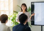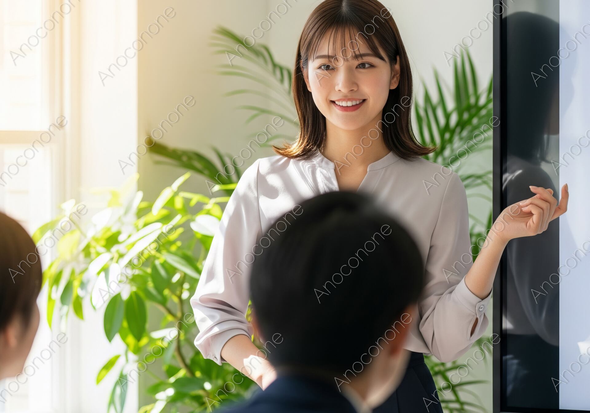 明るいオフィス空間で、ライトグレーのブラウスとダークカラーのスカートを着用した女性が、聴衆に向かって大きなスクリーンを背にプレゼンテーションを行っています。自信に満ちた笑顔と、聴衆に語りかけるようなジェスチャーが、効果的なコミュニケーションとリーダーシップを表現しています。ビジネス、プレゼン、会議、講演、キャリアといったテーマの広告やウェブコンテンツに最適な一枚です。