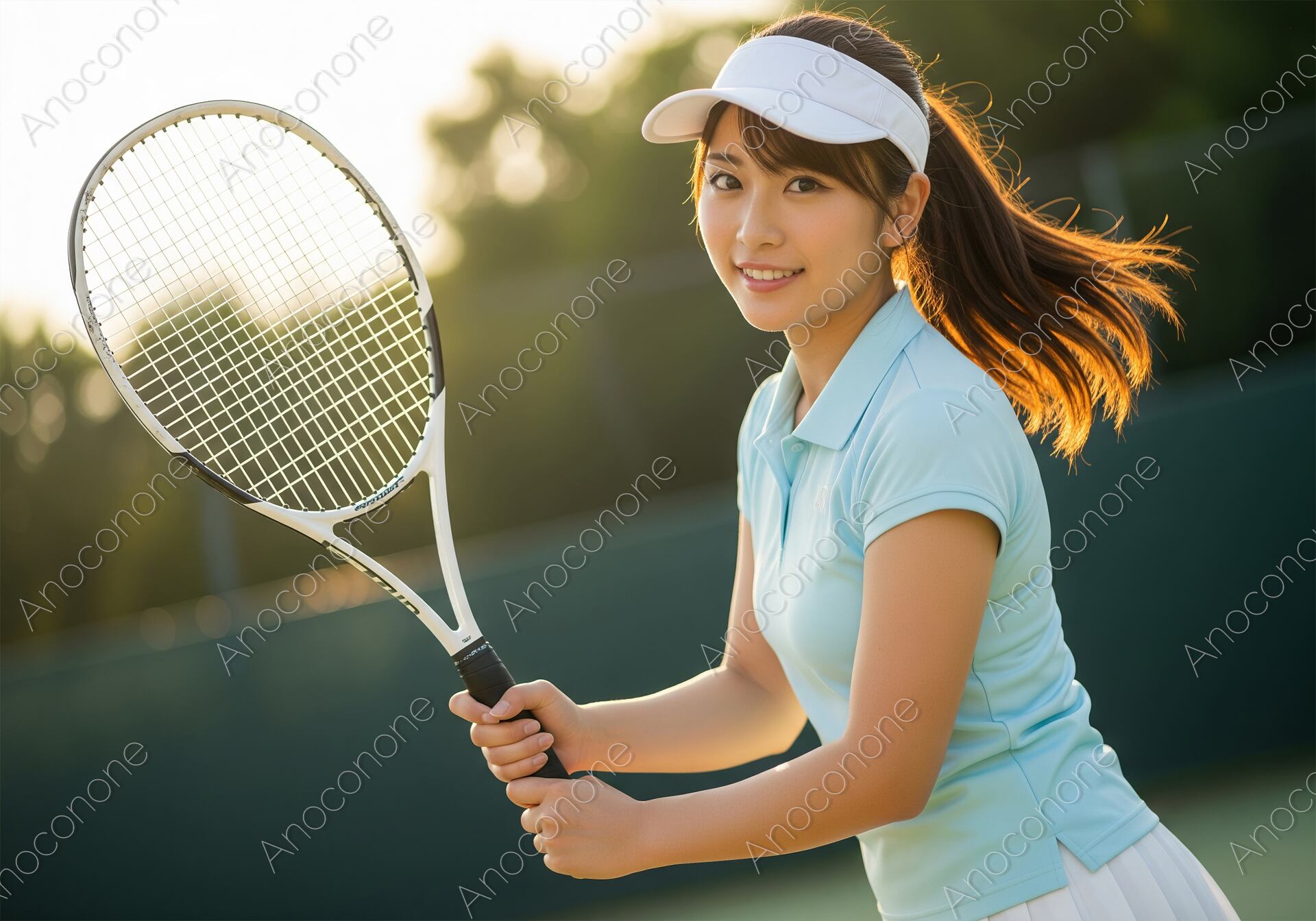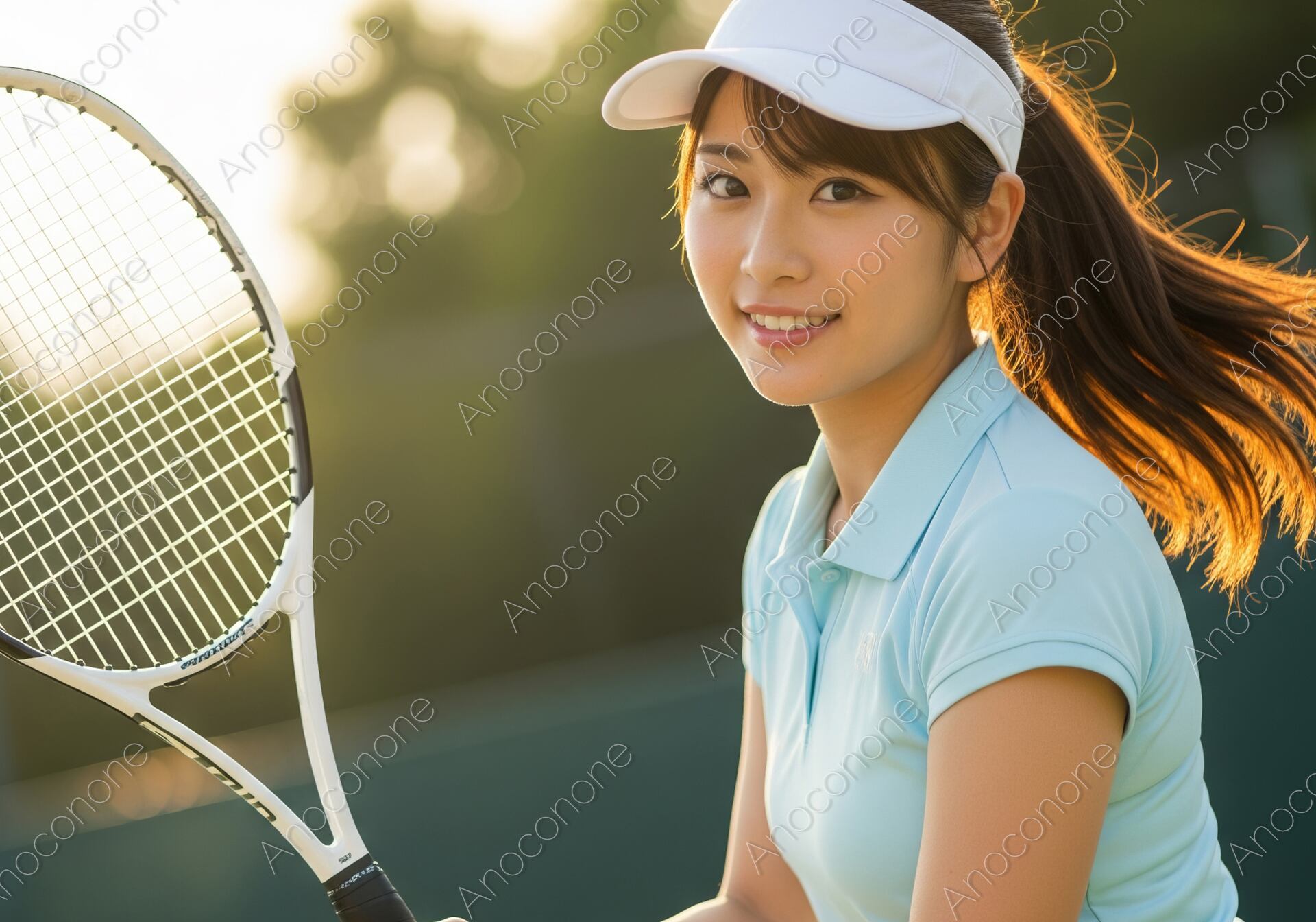 画像素材:黄金色の夕陽が差し込むテニスコートで、ラケットを構え生き生きとした表情を浮かべる女性プレイヤーを捉えた一枚です。爽やかな水色のポロシャツと白いサンバイザーを身に纏い、風になびくポニーテールがスポーツならではの躍動感と清々しさを演出しています。逆光気味の柔らかな光が被写体を包み込み、健康的な肌の質感や瞳の輝きをより一層引き立てています。背景には屋外コートの緑が程よくぼかして描写されており、趣味のテニスや本格的なトレーニングに励む「アクティブなライフスタイル」を象徴する構図となっています。高精細な描写により、ラケットのガットの細部やウェアの質感まで鮮明に表現された、非常にクオリティの高いビジュアルです。スポーツウェアのプロモーション、テニススクールの広告、健康・フィットネス関連のメディア、または「休日のリフレッシュ」をテーマにしたコンテンツのメインビジュアルに最適な素材です。