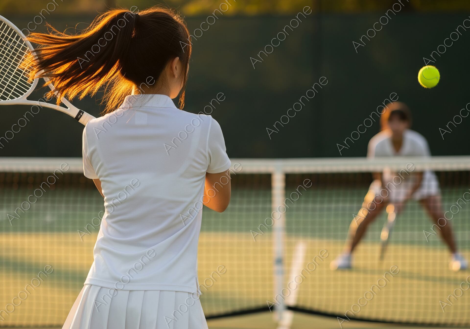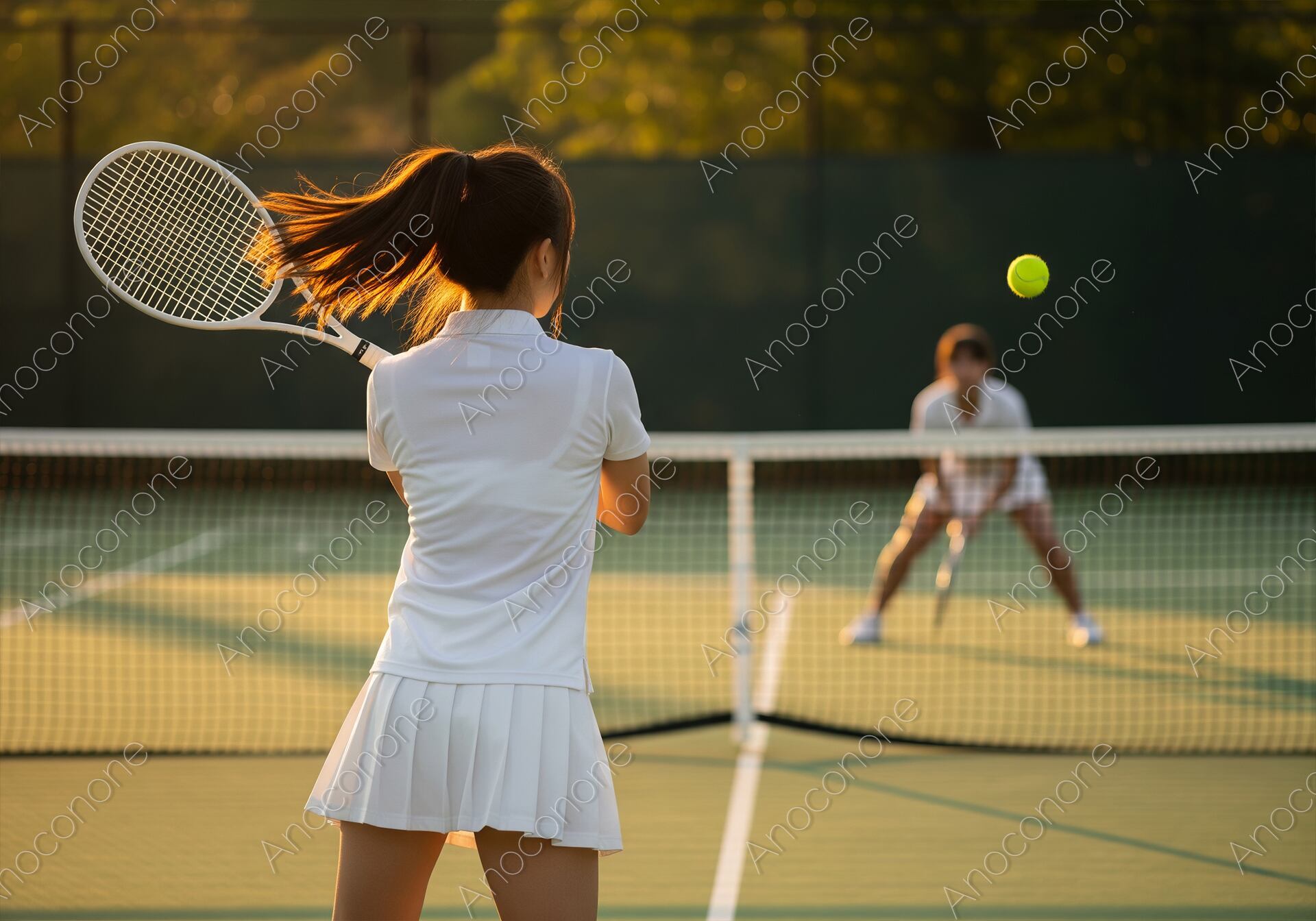 画像素材:黄金色の夕陽が差し込むテニスコートで、真剣にラリーを繰り広げるプレイヤーの後ろ姿を捉えています。ラケットを振り切り、ポニーテールが美しくなびく一瞬の動作には、スポーツならではの躍動感と集中力が凝縮されています。ネット越しには対戦相手が低く構えてボールを待つ姿が描かれ、試合の緊張感と臨場感を鮮明に演出しています。逆光気味の柔らかな光が被写体の輪郭を縁取り、飛んでいるテニスボールを際立たせるドラマチックなライティングが印象的です。高精細な描写により、ウェアの質感やコートの表面、周囲の木々のディテールまで精緻に表現された、非常にクオリティの高いビジュアルです。スポーツ用品の広告、テニススクールの募集案内、または「健康的なライフスタイル」や「挑戦」をテーマにしたコンテンツのメインビジュアルに最適な素材です。
