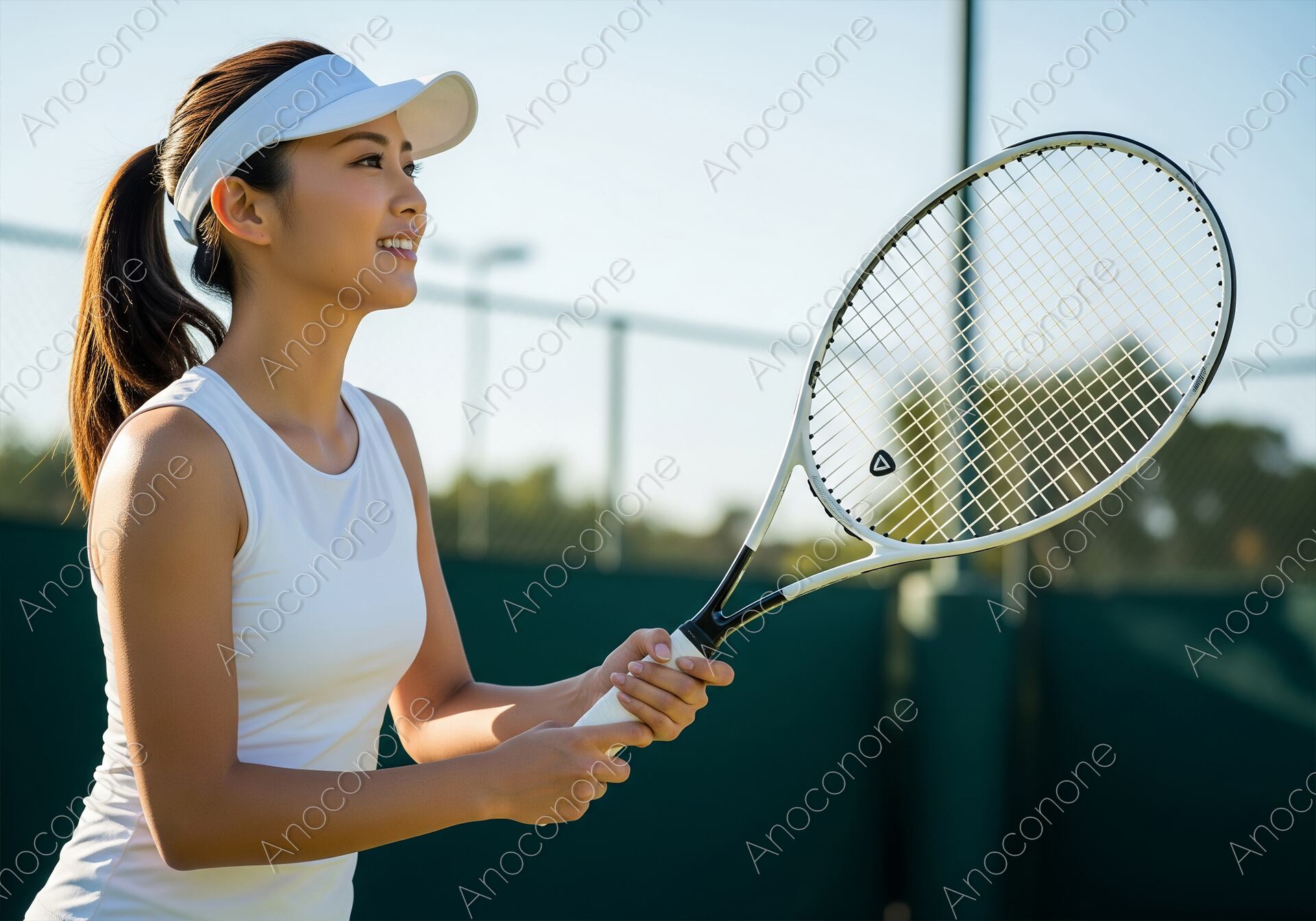 画像素材:抜けるような青空が広がる屋外テニスコートで、ラケットを手に晴れやかな表情を浮かべる女性プレイヤーの姿を捉えています。白のバイザーとタンクトップを身に纏った清潔感のある装いが、スポーツならではの清々しさと健康的でアクティブなライフスタイルを演出しています。横顔から伝わる柔らかな微笑みと、ポニーテールにまとめた髪のラインが、試合や練習の合間のリラックスしたひとときを感じさせます。背景にはコートを囲むフェンスや遠くの樹木が程よくぼかして描写されており、被写体の透明感ある美しさをより一層引き立てています。高精細な描写により、ラケットの精緻な構造やウェアの質感まで鮮明に表現された、非常にクオリティの高いビジュアルです。スポーツウェアのプロモーション、テニススクールの募集、健康やフィットネスをテーマにしたメディア、または「前向きな日常」を象徴する広告素材として最適な一枚です。
