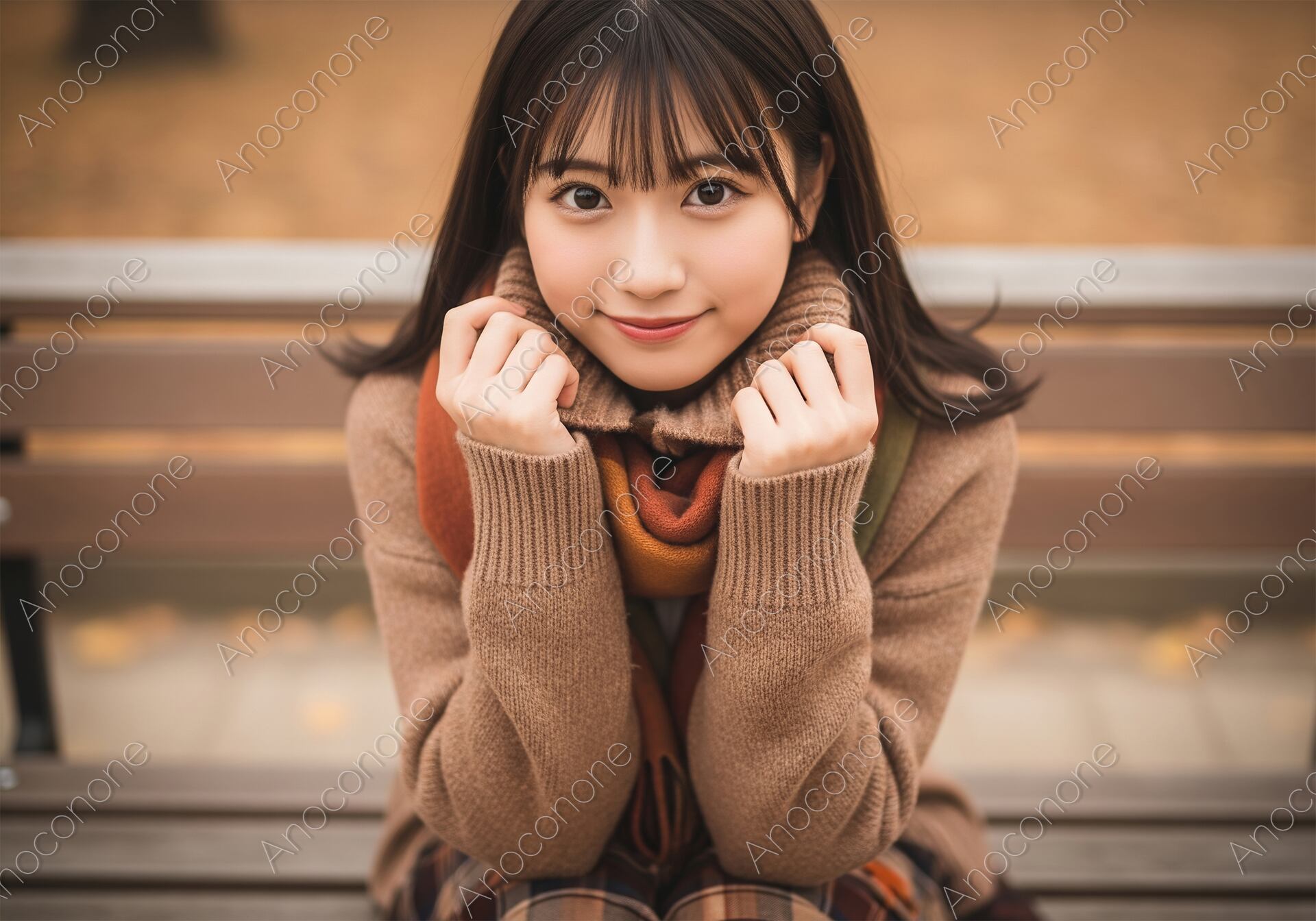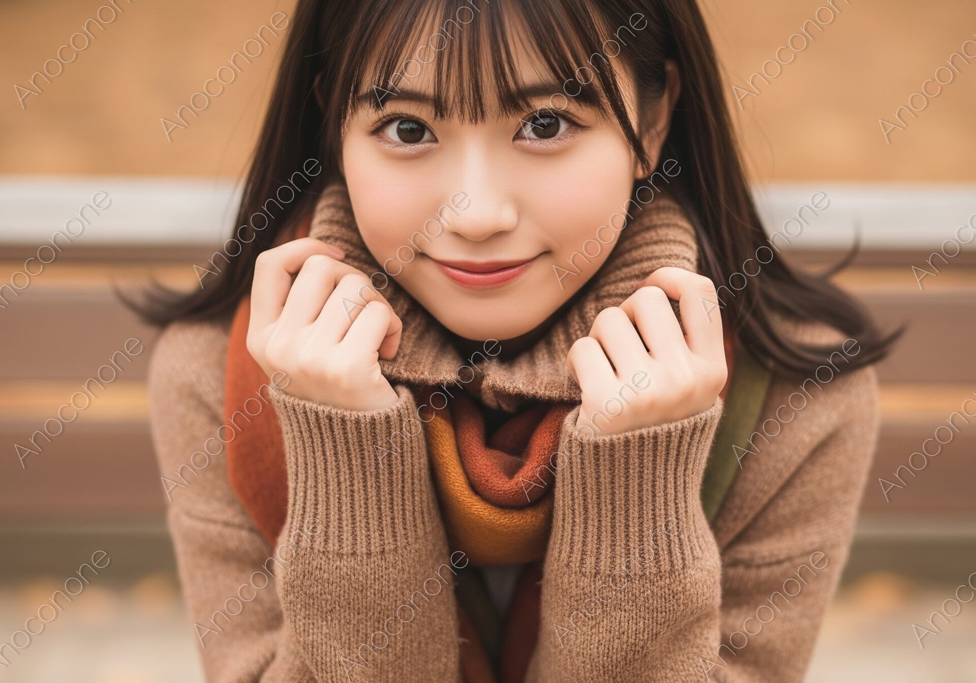画像素材:秋の気配が漂う公園のベンチで、暖かなタートルネックのニットとボリュームのあるマフラーに身を包んだ女性を捉えたポートレートです。マフラーの襟元に手を添え、少し首をすくめるような仕草と穏やかな微笑みが、肌寒い季節ならではの愛らしさと季節感を演出しています。ベージュやオレンジ、ブラウンといった暖色系でまとめられたコーディネートが、背景の柔らかなボケ味と相まって、画面全体に温もりと安らぎを与えています。こちらを真っ直ぐに見つめる大きな瞳と、ナチュラルに整えられた前髪が、被写体のピュアで親しみやすい魅力を引き立てています。高精細な描写により、ニットの編み目やマフラーの柔らかな質感まで鮮明に表現された、非常に高品質な一枚です。秋のファッション特集、ライフスタイル誌の表紙、または「癒やし」や「冬の訪れ」をテーマにした広告ビジュアルに最適な素材です。
