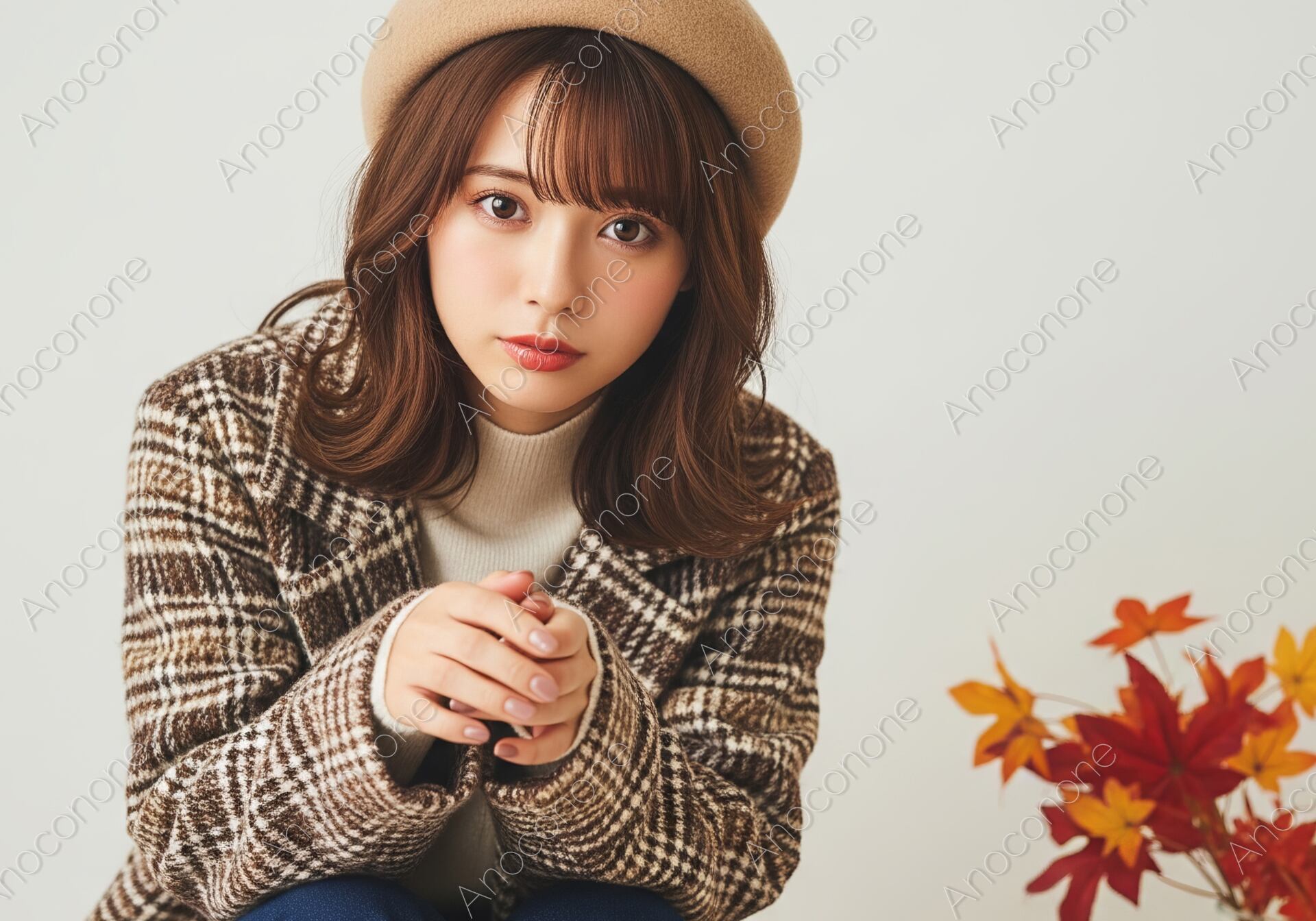 画像素材:秋らしい深みのあるチェック柄のロングコートに、柔らかなベージュのベレー帽を合わせた、クラシカルで洗練されたファッションポートレートです。インナーに白のハイネックニット、ボトムスにネイビーのパンツを配した上品なコーディネートが、落ち着いた大人の女性の魅力を引き立てています。傍らに添えられた鮮やかな紅葉の枝木とブラウンのミニバッグが、季節感をより一層際立たせ、静かで知的な秋のひとときを演出しています。こちらを静かに見つめる純粋な眼差しと、トレンド感のある外ハネのミディアムヘアが、洗練された都会的な印象を与えます。高精細な描写により、コートの生地の質感や紅葉の細かな葉脈まで鮮明に表現された高品質な一枚です。秋のファッション特集、ライフスタイルメディアのメインビジュアル、またはアパレルブランドのカタログ素材として最適なビジュアルです。