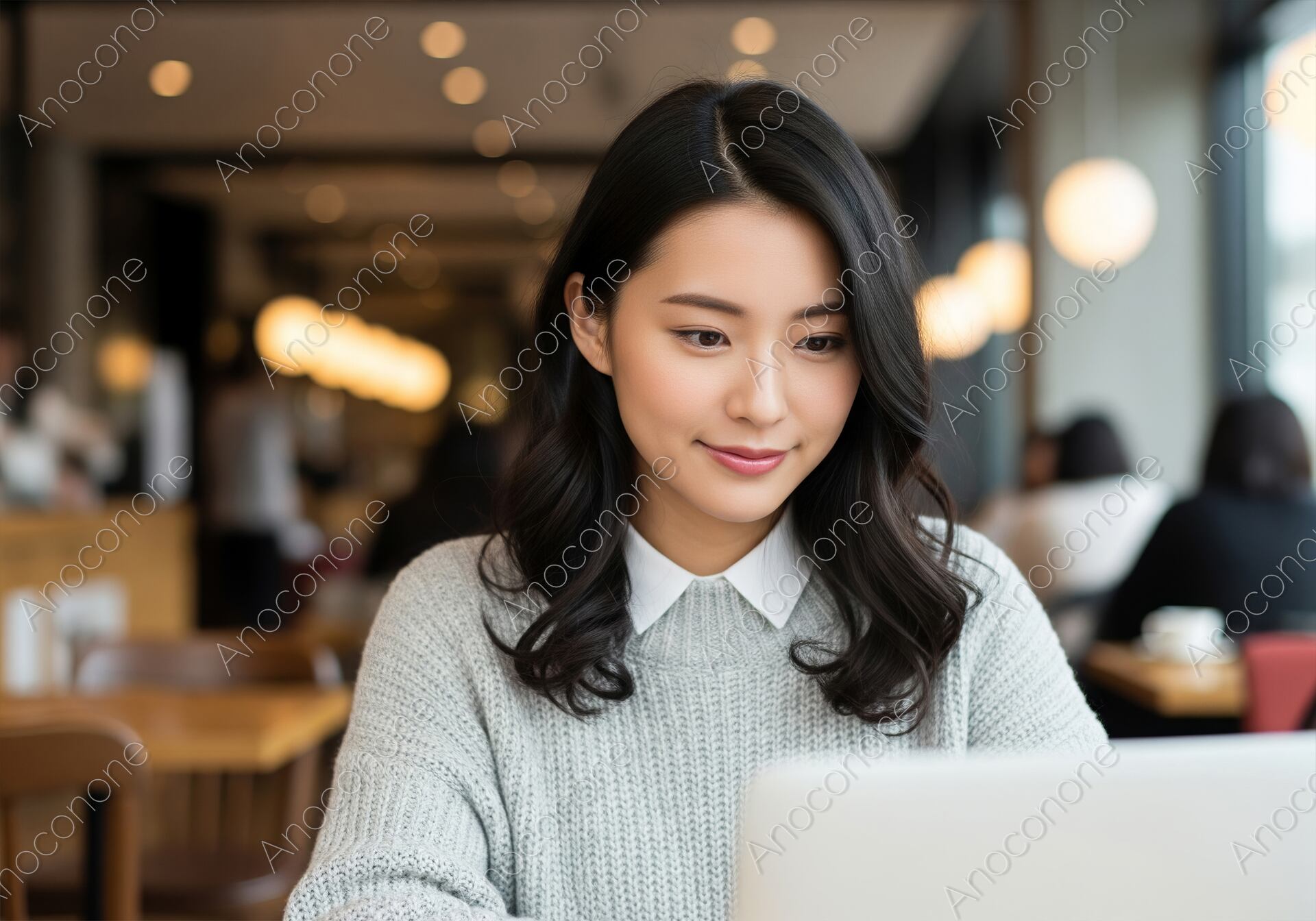 温かい照明が灯るカフェで、ライトグレーのニットに白いシャツを重ね着した女性が、ノートパソコンの画面を見つめ、集中して作業しています。リラックスしながらも効率的に仕事を進める彼女の姿は、場所を選ばない現代の働き方を表現しています。リモートワーク、カフェ、仕事、ライフスタイルといったテーマの広告やウェブコンテンツに最適な一枚です。