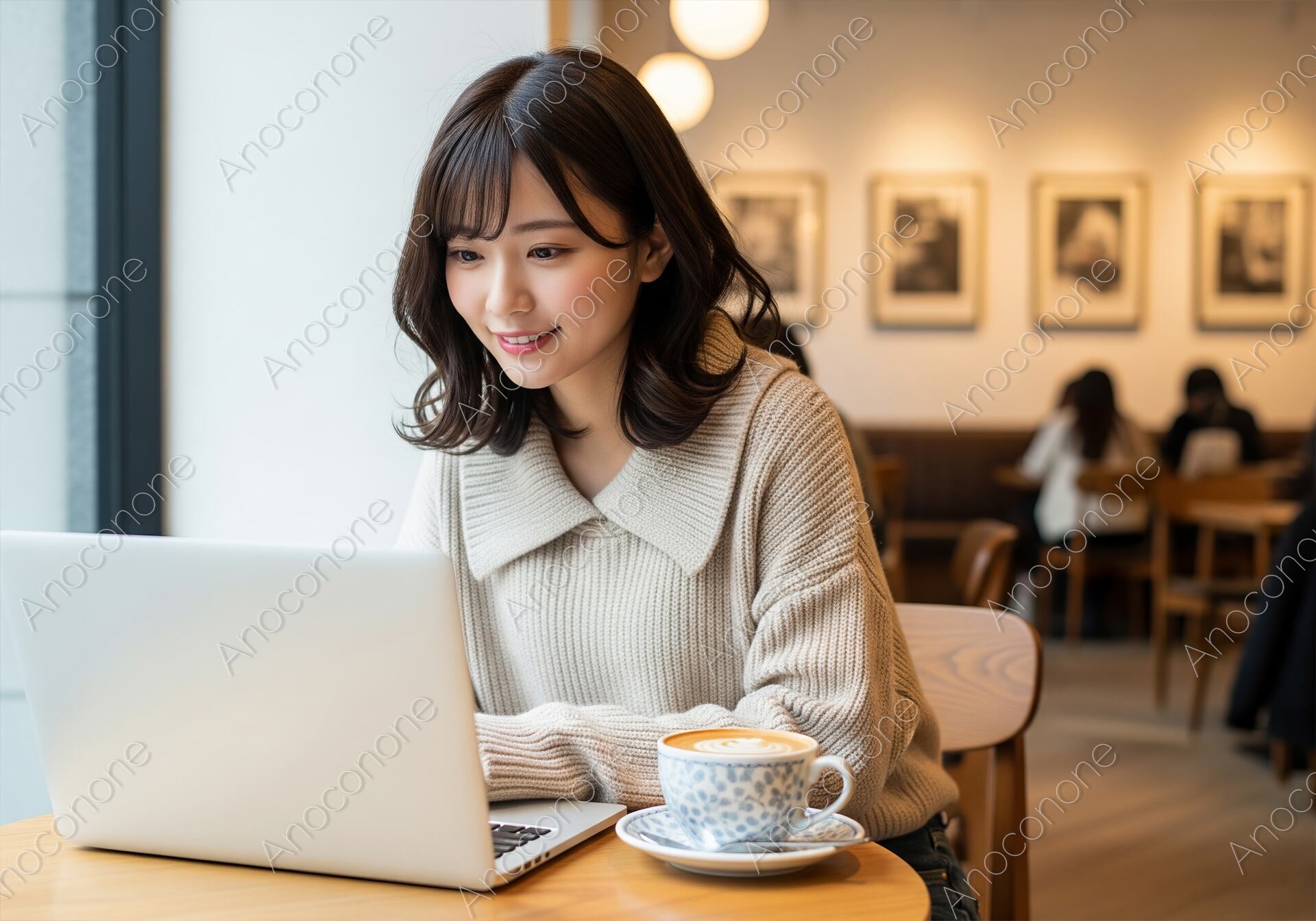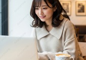 温かい照明が灯るカフェで、大きな襟が特徴のベージュのニットを着用した女性が、ノートパソコンに向かい明るい笑顔で作業しています。ラテが置かれたテーブルと、リラックスしながらも集中する表情が、現代の柔軟で快適な働き方を表現しています。リモートワーク、カフェ、仕事、ライフスタイルといったテーマの広告やウェブコンテンツに最適な一枚です。