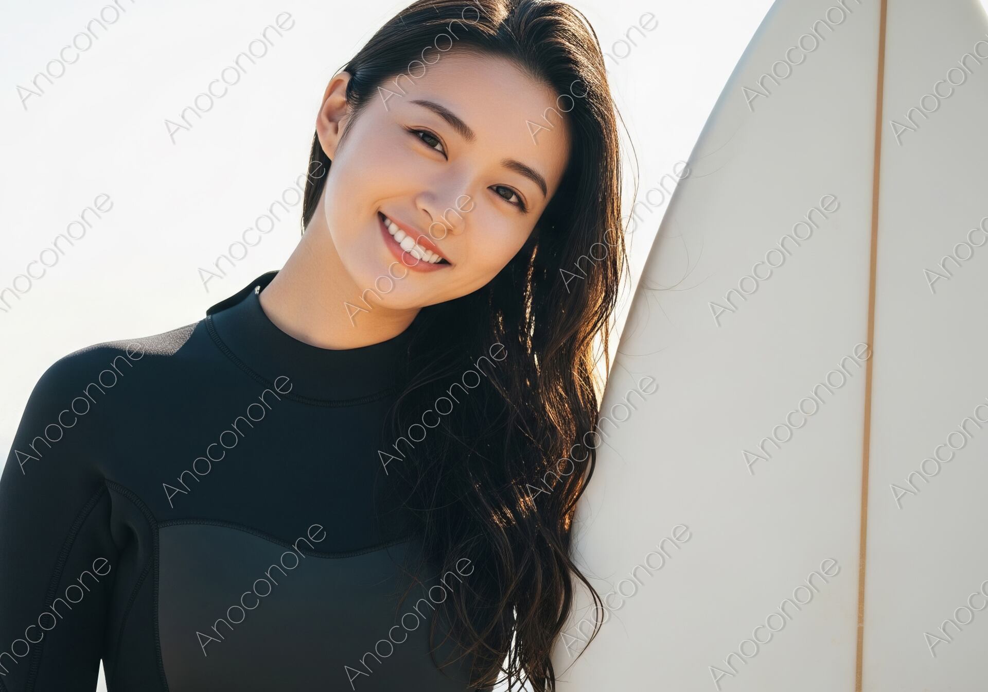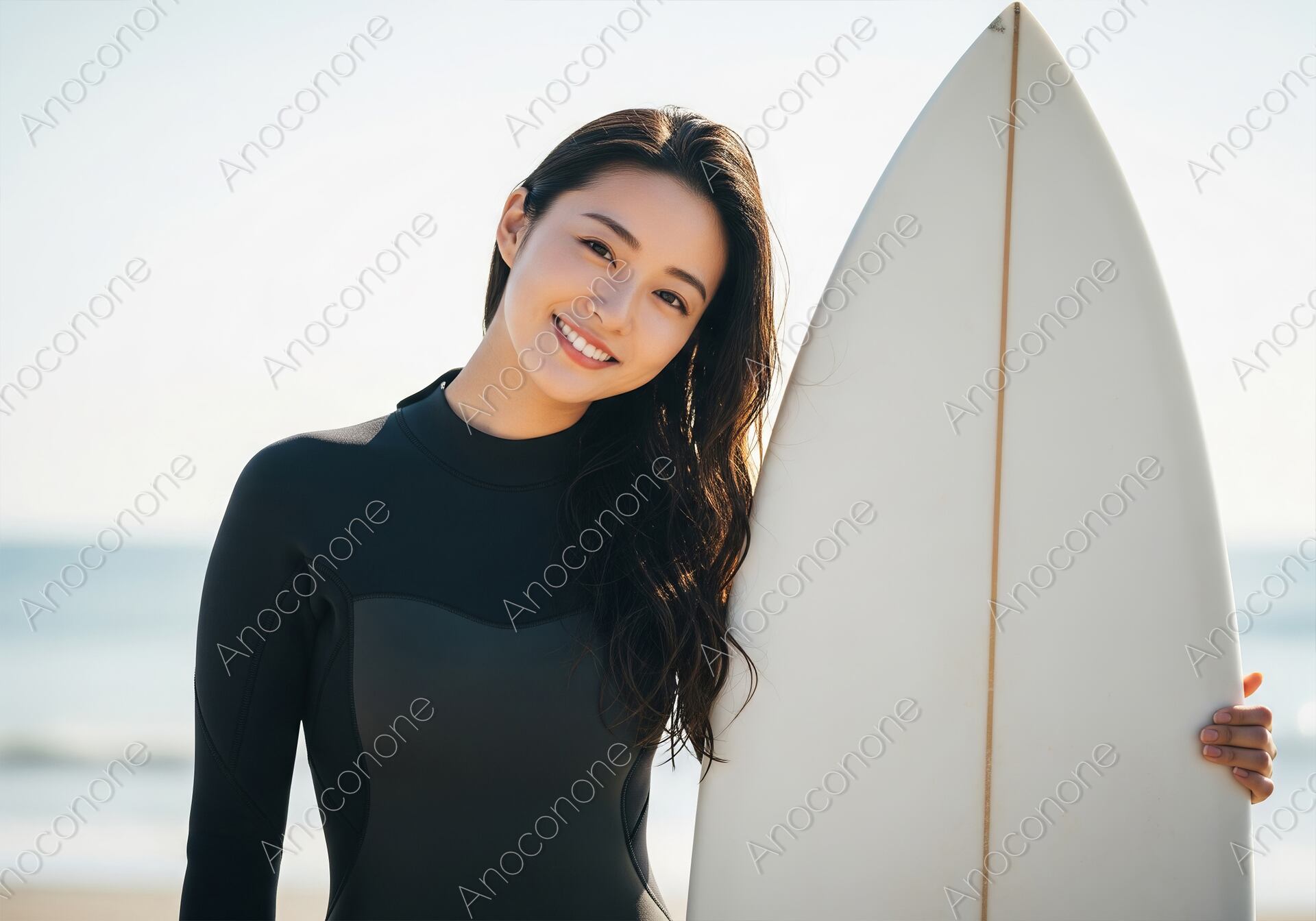 画像素材:陽光がキラキラと反射する美しい砂浜を背景に、サーフボードを傍らに抱えて晴れやかな笑顔を見せる女性を捉えた一枚です。黒のウェットスーツをスマートに着こなし、潮風に自然になびくロングヘアが、海と共に生きる健康的でアクティブなライフスタイルを象徴しています。少し首を傾げた親しみやすいポーズと、瞳の輝きが印象的なその姿は、見る人にポジティブなエネルギーと安らぎを同時に与えます。背後に広がる水平線と淡いブルーの空が、開放感あふれるビーチの空気感をリアルに演出しています。高精細な描写により、ウェットスーツの質感やボードの滑らかなフォルム、そして被写体の生き生きとした表情まで鮮明に表現された高品質なビジュアルです。サーフィンやマリンスポーツのプロモーション、旅行・レジャー関連のメインビジュアル、または「自分を磨く休日」をテーマにしたライフスタイルメディアの素材として最適な一枚です。