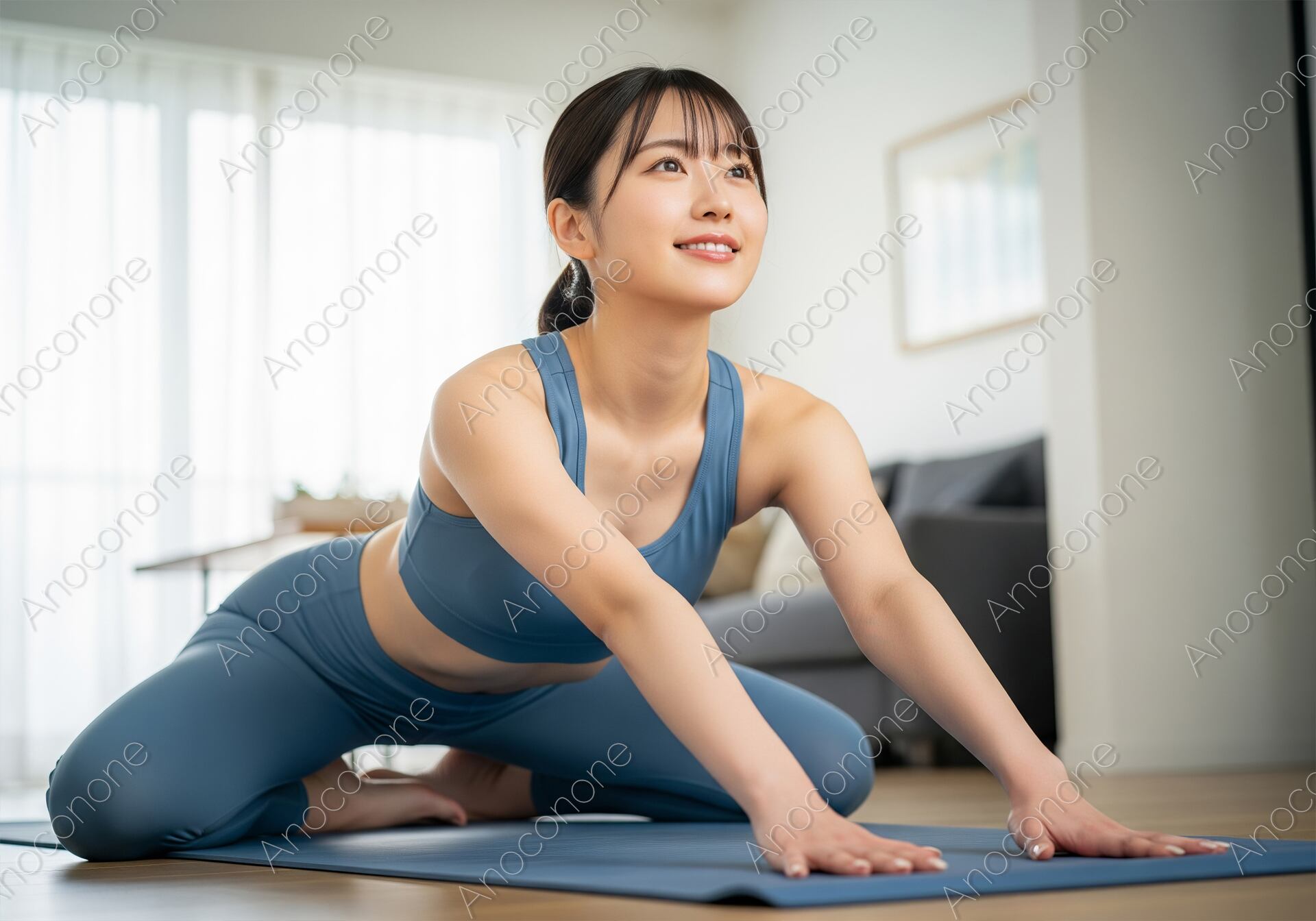明るい自然光が差し込む室内で、ダークブルーのスポーツブラとレギンスを着用した女性が、マットの上でしなやかに体を伸ばすポーズをとっています。一点を見つめる集中した眼差しと、穏やかな笑顔が、心身の健康と向き合う真摯な姿勢を表現しています。フィットネス、健康、美容、自己ケアといったテーマの広告やウェブコンテンツに最適な一枚です。