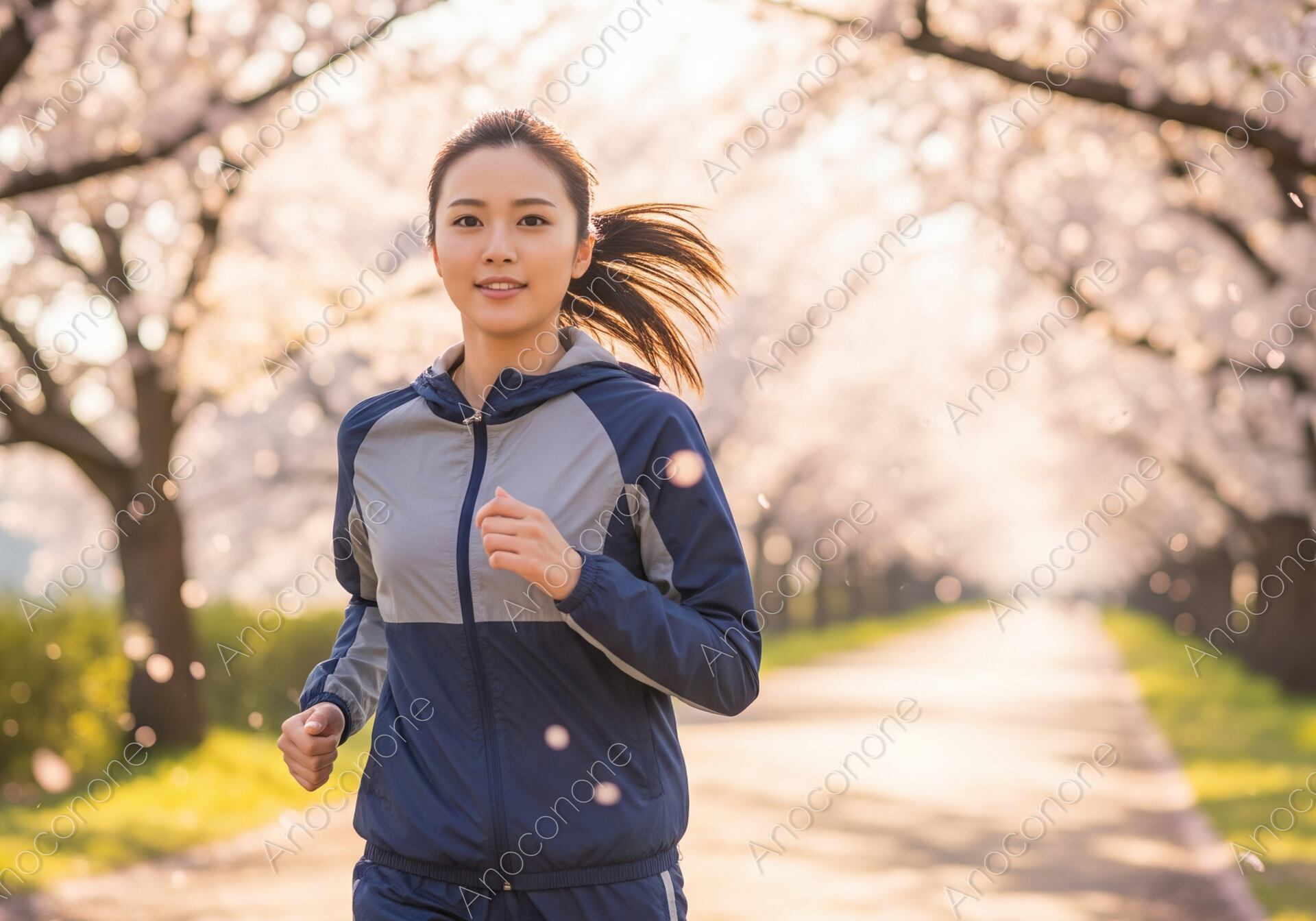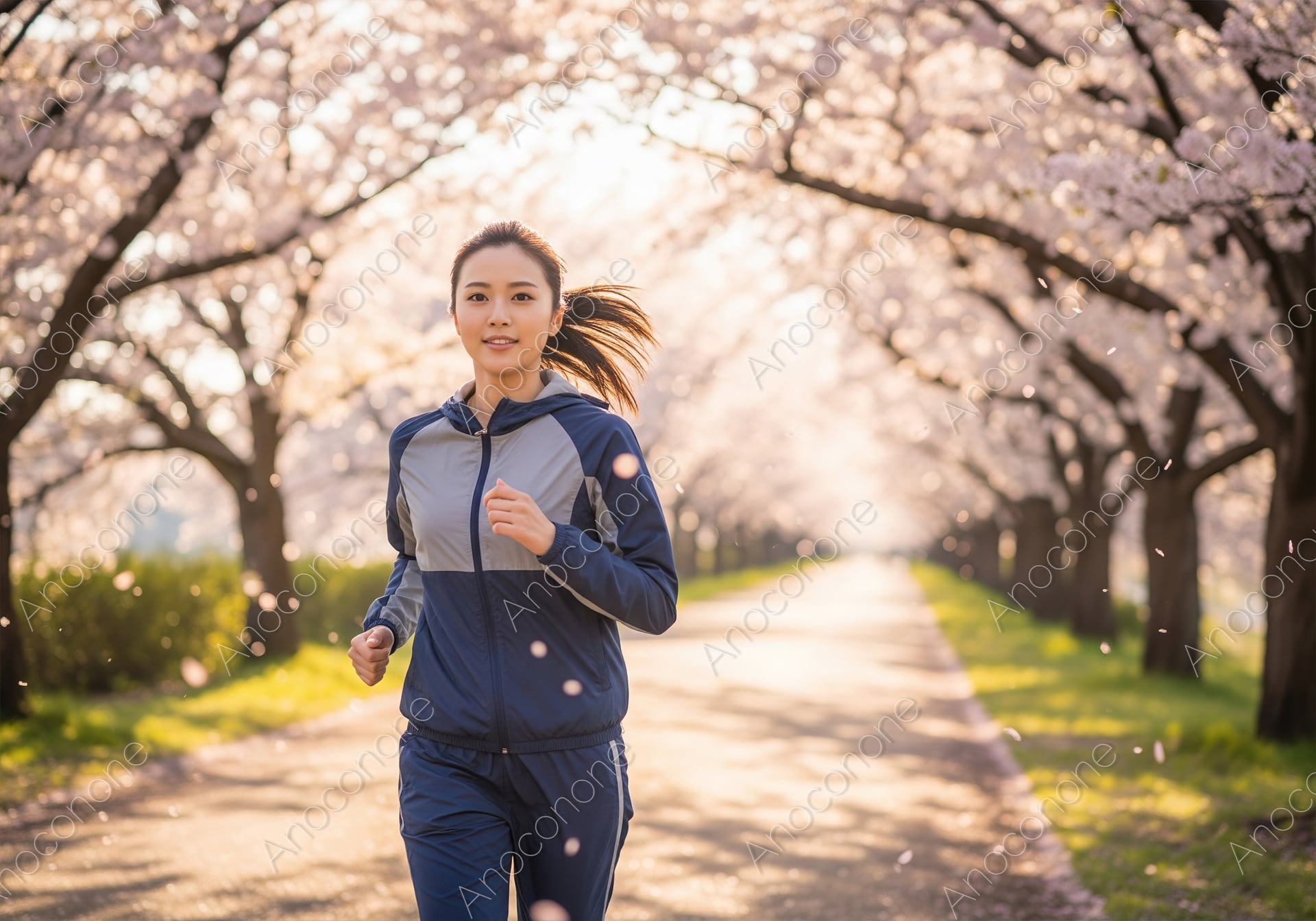桜の花が満開の並木道で、グレーと紺のパーカーとパンツを着用した女性が、颯爽とジョギングをしています。舞い散る花びらの中を走る姿と、前向きな表情が、運動を楽しむ喜びと、春の清々しさを表現しています。ランニング、スポーツ、フィットネス、健康といったテーマの広告やウェブコンテンツに最適な一枚です。