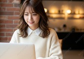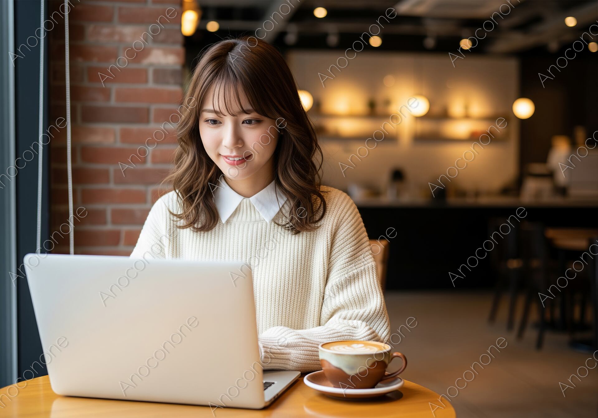温かい照明と自然光が差し込むカフェで、ベージュのリブニットに白いシャツを重ね着した女性が、ノートパソコンに向かい集中して作業しています。コーヒーカップが置かれたテーブルと、リラックスしながらも仕事に励む表情が、現代の柔軟で快適な働き方を表現しています。リモートワーク、カフェ、仕事、ライフスタイルといったテーマの広告やウェブコンテンツに最適な一枚です。