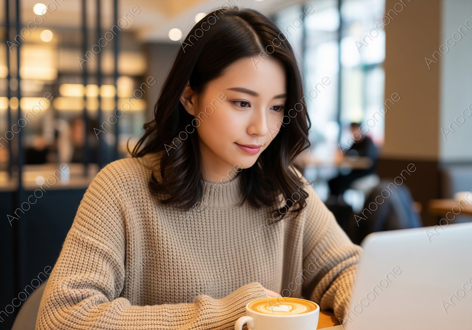 温かい照明が灯るカフェで、ベージュのニットを着用した女性が、ノートパソコンの画面を見つめ、集中して作業しています。美しいラテアートが描かれたカップが置かれ、リラックスしながらも効率的に仕事を進める、現代の柔軟な働き方を表現しています。リモートワーク、カフェ、仕事、ライフスタイルといったテーマの広告やウェブコンテンツに最適な一枚です。