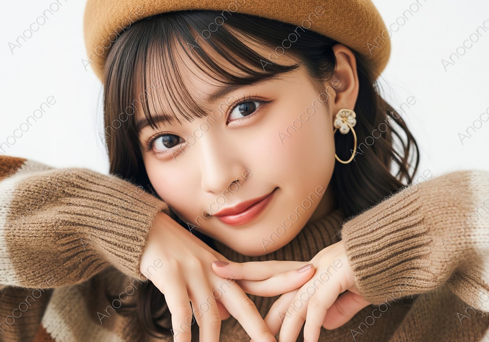 画像素材:秋らしい暖色系のボーダー柄ニットに茶色のベレー帽を合わせた、季節感あふれるコーディネートの女性をアップで捉えた一枚です。顔の近くで両手を軽く合わせ、小首をかしげながらこちらを見つめるポーズがとても可愛らしく、親しみやすい印象を与えます。耳元には花の形をした大ぶりのイヤリングが輝き、全体のファッションに華やかさを添えています。背景はシンプルな白一色で構成されているため、女性の表情や衣装の質感が際立ち、被写体の魅力がストレートに伝わる構図となっています。肌の透明感や髪の柔らかな流れ、ニットの編み目まで細かく描写されており、清潔感のある高品質な仕上がりです。秋のトレンドファッションを紹介する記事や、カタログの表紙素材として活用できます。