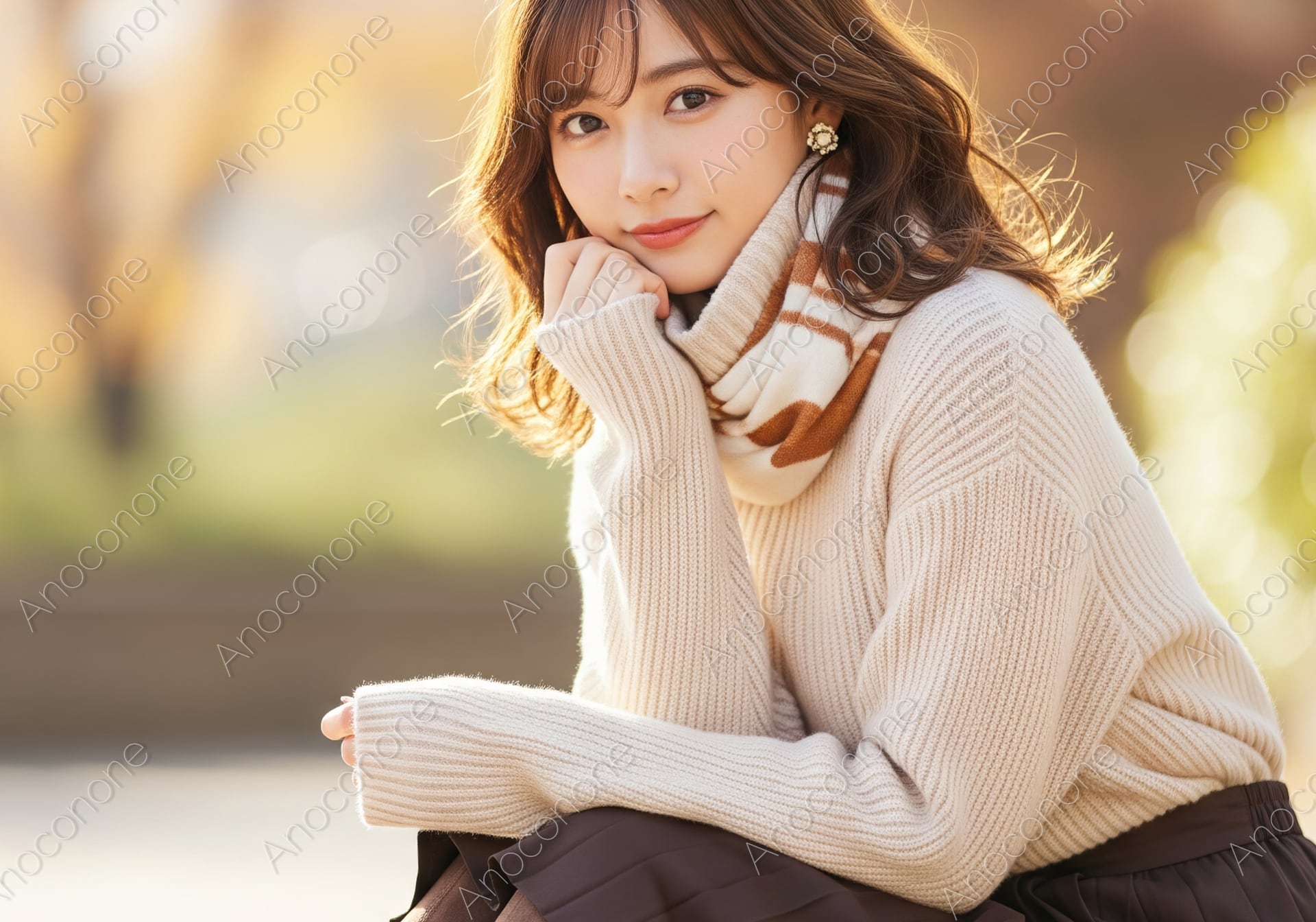 紅葉が始まった美しい秋の公園で、地面に腰を下ろしてリラックスしている女性を捉えた一枚です。白のタートルネックニットに茶色のプリーツスカート、そして首元にはボーダー柄のマフラーを巻いた、季節感たっぷりのコーディネートが目を引きます。女性は顎に軽く手を添え、優しく穏やかな眼差しをカメラに向けており、その表情からは落ち着いた大人の余裕が感じられます。背景には黄金色に色づいた木々や柔らかな木漏れ日が広がっており、秋特有の暖かみのある空気が画面全体を包み込んでいます。髪の毛一本一本やニットの細かな網目まで鮮明に描写されており、光の当たり方も自然で被写体の透明感を引き立てています。日常の何気ない瞬間をドラマチックに切り取ったような、情緒あふれる構成の画像です。秋のファッション特集やライフスタイル誌のイメージ素材として幅広く活用できます。