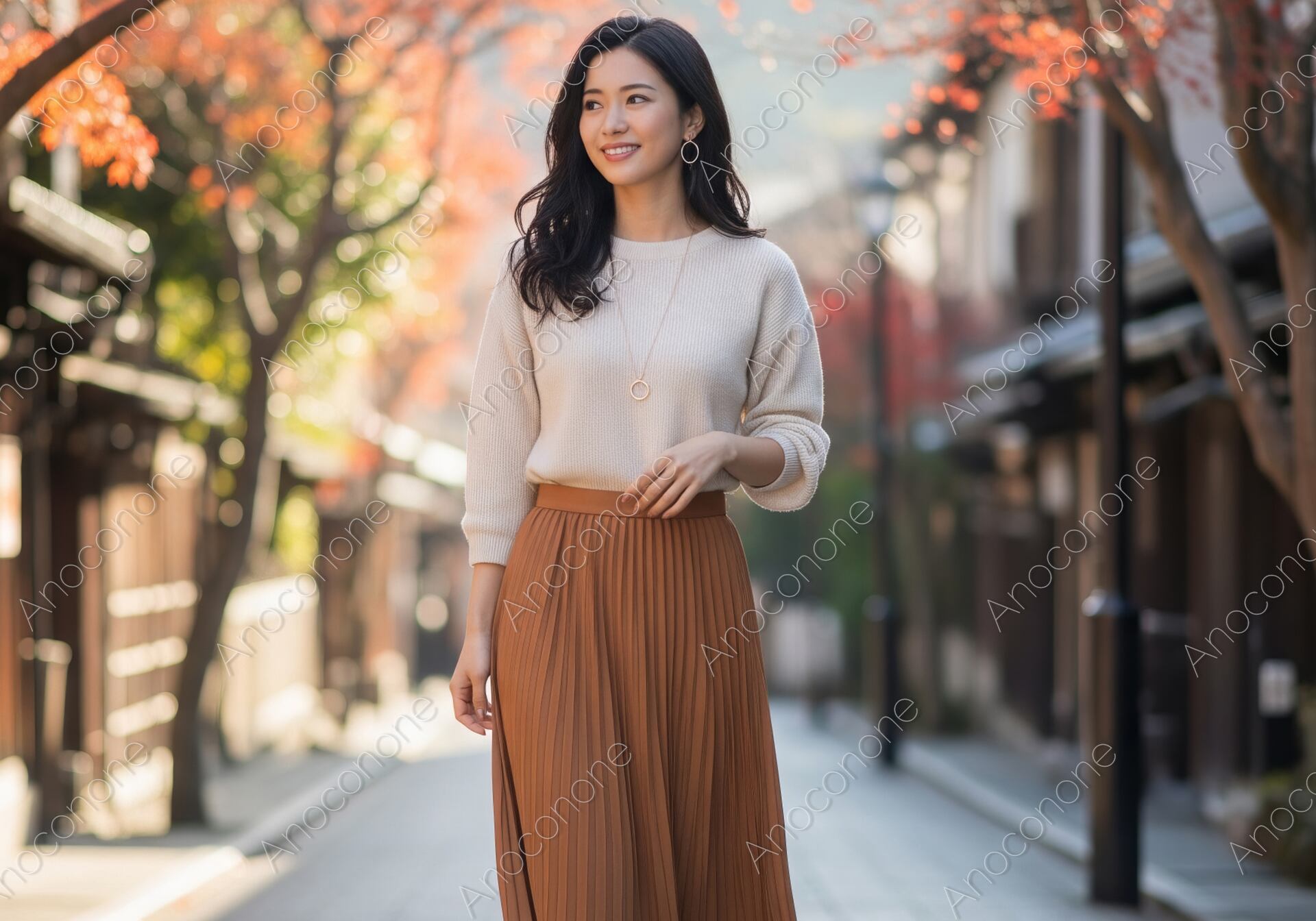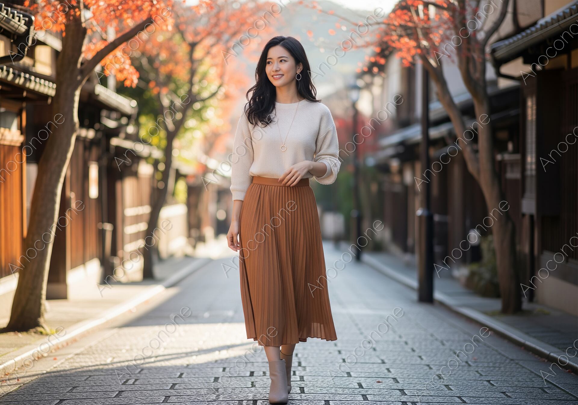 画像素材:歴史を感じさせる伝統的な家屋が並ぶ石畳の通りを、穏やかな表情で散策する様子を捉えています。白のシンプルなニットに、秋らしいテラコッタカラーのプリーツスカートを合わせた、上品で清潔感のあるコーディネートが目を引きます。背景には赤く色づいた紅葉が美しく配置され、奥行きのある街並みに季節の彩りを添えています。女性は遠くを見つめながら自然な笑顔を浮かべており、秋の休日を心から楽しんでいる情緒豊かな雰囲気が伝わります。柔らかな午後の日差しが通りを照らし、服の質感や髪の流れ、石畳の陰影まで非常にきめ細やかに描写されています。旅先でのワンシーンを切り取ったような、落ち着きと華やかさが同居した構成です。秋の観光プロモーションや大人の休日をテーマにした媒体に最適です。
