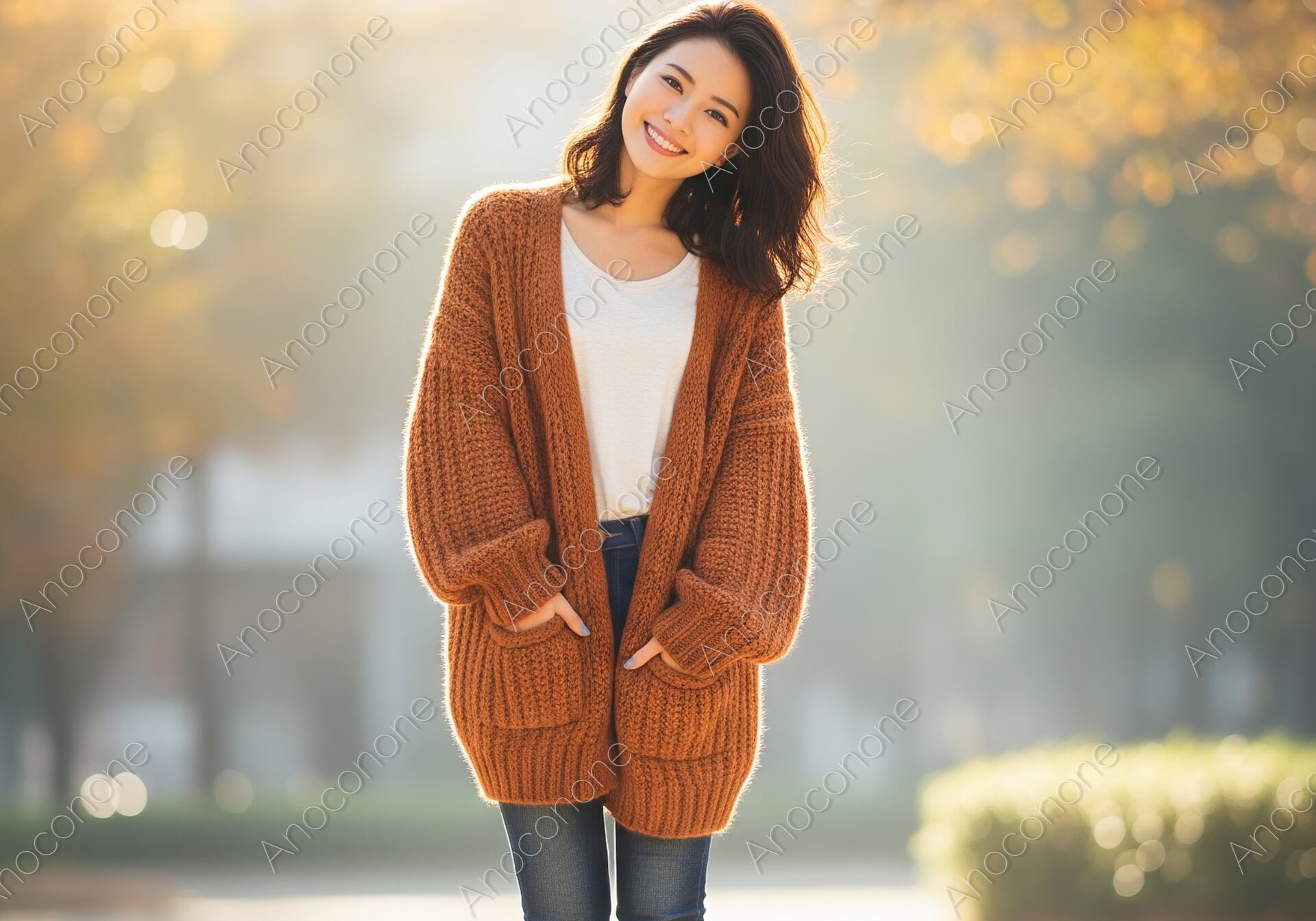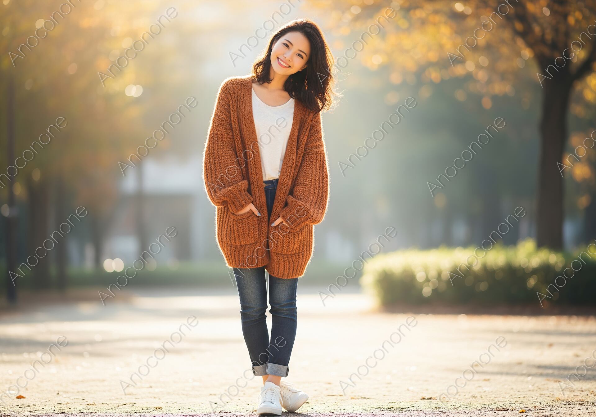 画像素材:黄金色に輝く木々を背景に、暖かな日差しの中でリラックスした表情を見せる女性を全身で捉えた一枚です。秋らしい深みのあるオレンジ色の厚手カーディガンを主役に、シンプルな白のカットソーとデニムパンツ、白いスニーカーを合わせたカジュアルで清潔感のあるコーディネートが目を引きます。女性はポケットに軽く手を入れ、小首をかしげながら輝くような笑顔を浮かべており、見ている側まで明るい気持ちにさせてくれます。背景の並木道は美しくぼけており、逆光気味に差し込む光が女性のシルエットを柔らかく際立たせています。季節の移ろいを感じさせる暖かみのある色彩と、日常の幸せな瞬間を切り取ったような自然体な構図が魅力です。秋のお出かけやトレンドのカジュアルファッションを提案するブログ、ライフスタイル誌の素材に最適です。