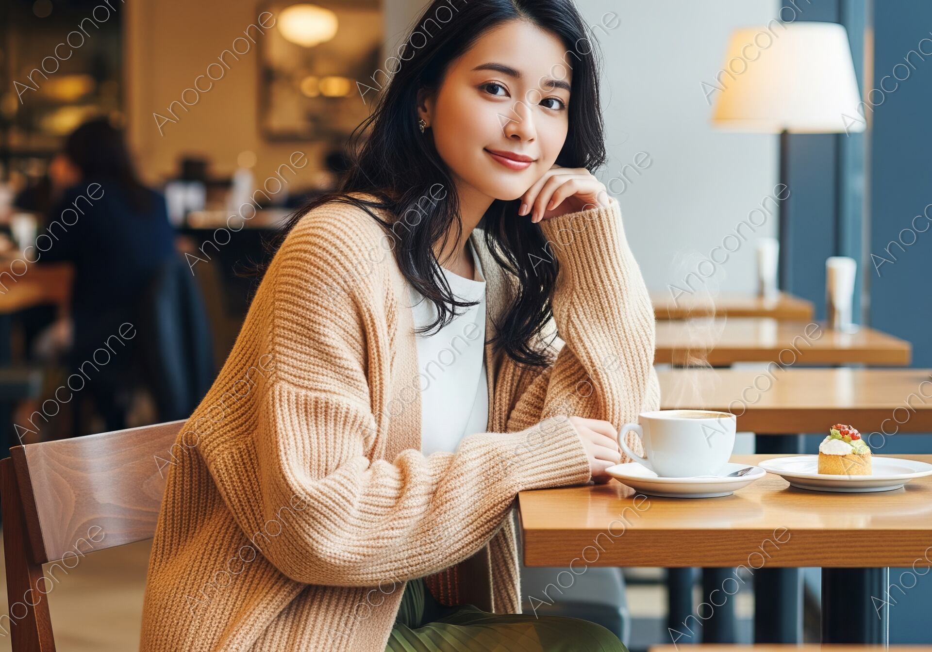画像素材:洗練された雰囲気のモダンなカフェで、窓際の席に座りリラックスした時間を過ごす様子を捉えています。ベージュの柔らかなロングカーディガンに、落ち着いたグリーンのプリーツスカートを合わせた、上品で季節感のあるコーディネートが目を引きます。テーブルの上には湯気が立つコーヒーと可愛らしいケーキが並び、午後のティータイムを楽しむ穏やかな空気感が伝わります。女性は頬に手を添えて優しく微笑んでおり、その表情からは日常の喧騒を離れた心地よい充足感が感じられます。窓から差し込む自然光が室内を柔らかく照らし、被写体の透明感のある肌や髪の質感を美しく際立たせています。背景のカフェのインテリアも適度にぼかされており、人物の存在感が際立つ構図です。大人の休日やカフェでの優雅なひとときを提案する素材として最適です。