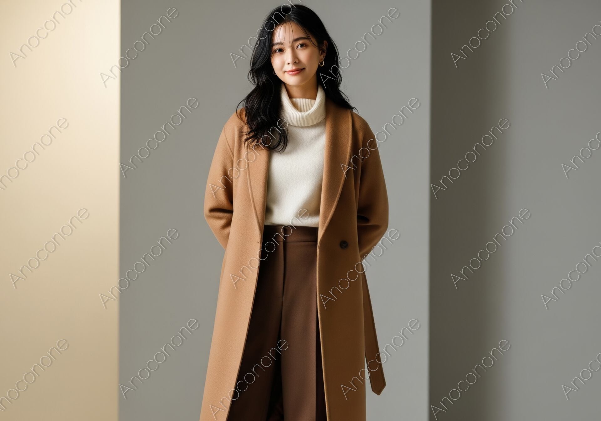 温かみのある光が差し込む室内で、キャメル色のロングコートと白いタートルネック、ブラウンのワイドパンツを着用した女性が、穏やかな微笑みでカメラに視線を向けています。洗練された大人の着こなしと、自信に満ちた表情が、秋から冬にかけての都会的なスタイルを表現しています。秋ファッション、ライフスタイル、ポートレート、ビジネスといったテーマの広告やウェブコンテンツに最適な一枚です。
