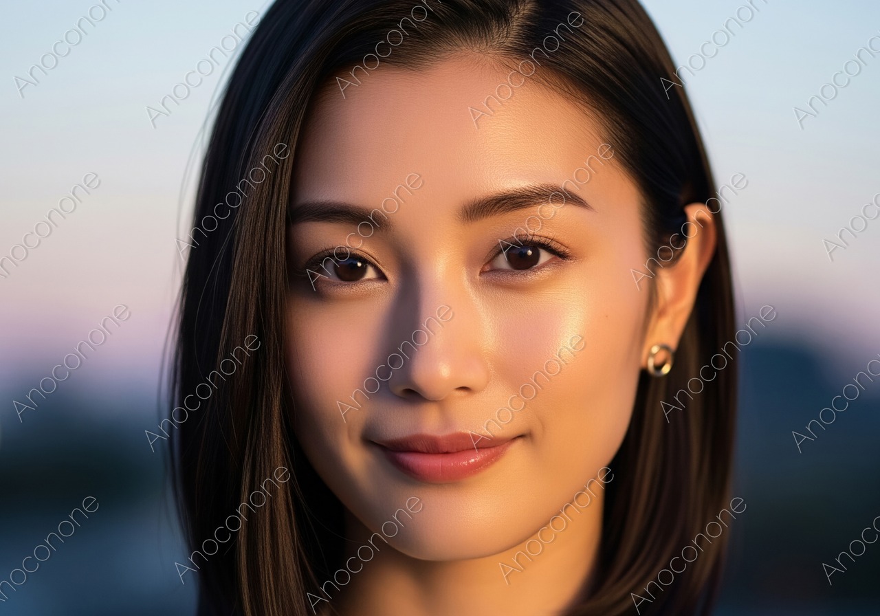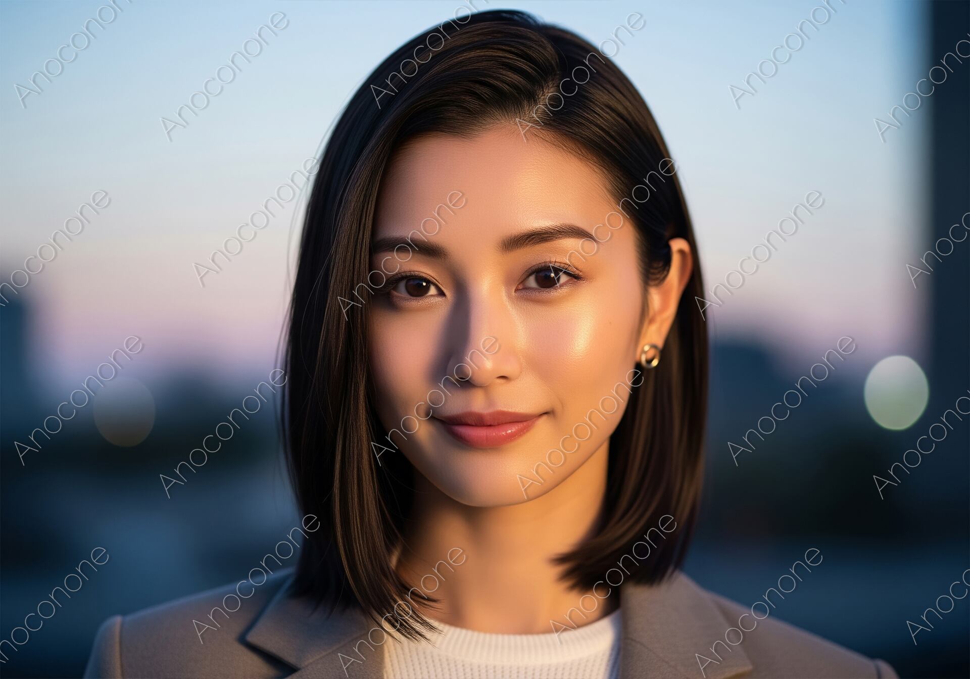 トワイライトの空にビル群が浮かび上がる都会の景色を背景に、ライトグレーのジャケットを着用した女性が、自信に満ちた穏やかな笑顔でカメラに微笑んでいます。洗練されたミディアムヘアと、プロフェッショナルな佇まいが、ビジネスシーンにおける知性と力強さを表現しています。キャリア、ビジネス、都会のライフスタイルといったテーマの広告やウェブコンテンツに最適な一枚です。