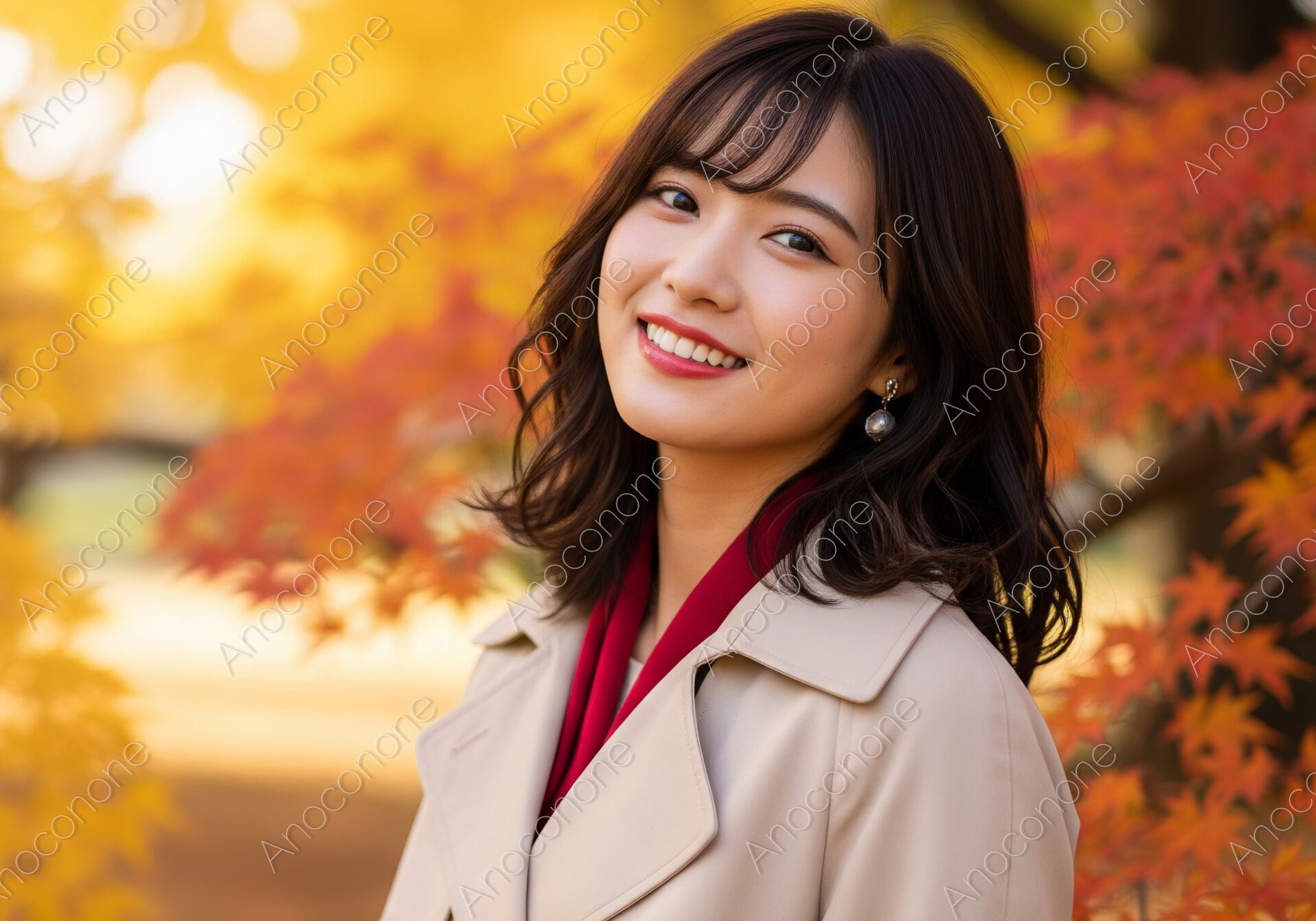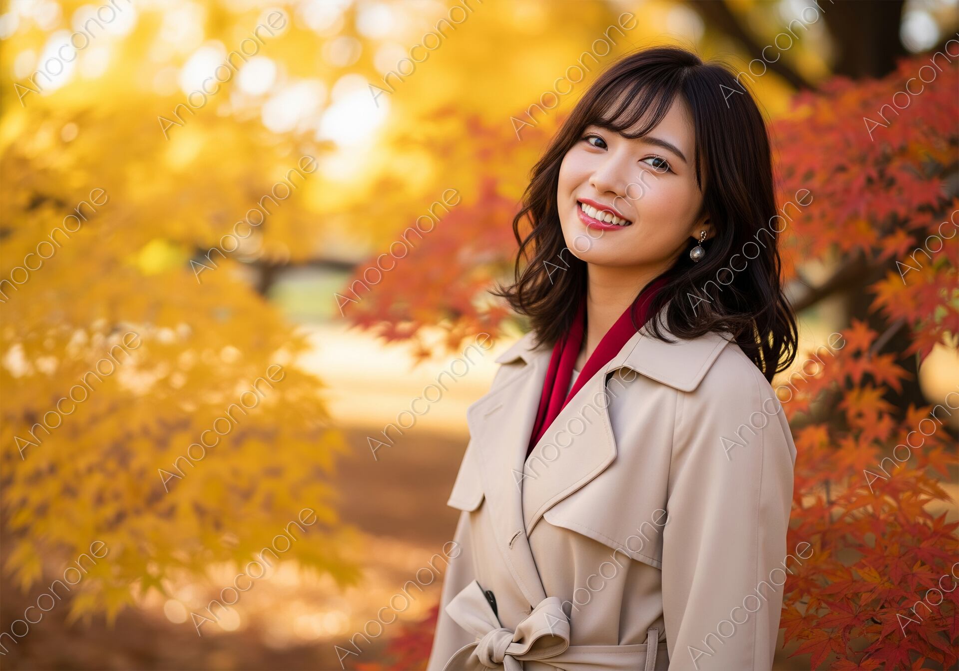 画像素材:赤や黄色に見事に色づいた紅葉が広がる公園で、秋の装いを楽しんでいる女性を捉えています。ベージュのトレンチコートを上品に着こなし、首元からのぞく赤いマフラーがコーディネートのアクセントになっています。女性はカメラに向かって輝くような笑顔を見せており、その表情からは秋の清々しい空気を感じながら散策を楽しむ充実感が伝わります。背景の紅葉は光を受けて美しくぼけており、被写体の透明感のある肌や柔らかな髪の質感を際立たせています。耳元に揺れるパールのイヤリングが、落ち着いた大人のファッションに華やかさを添えています。自然光が全体を優しく包み込み、温かみのある季節の移ろいを感じさせる構図です。秋の観光スポット紹介や、季節のファッションをテーマにした広告素材として活用できます。