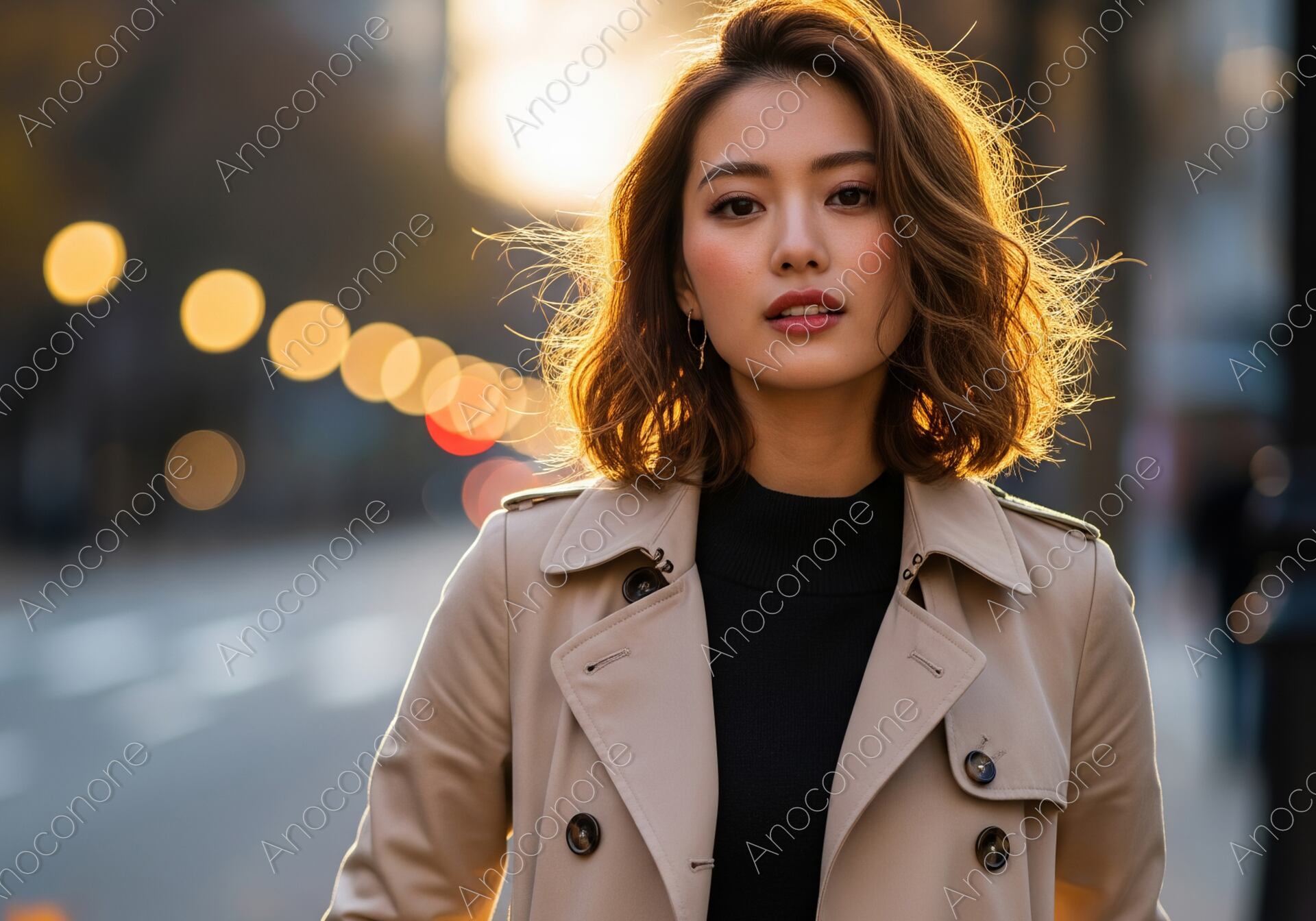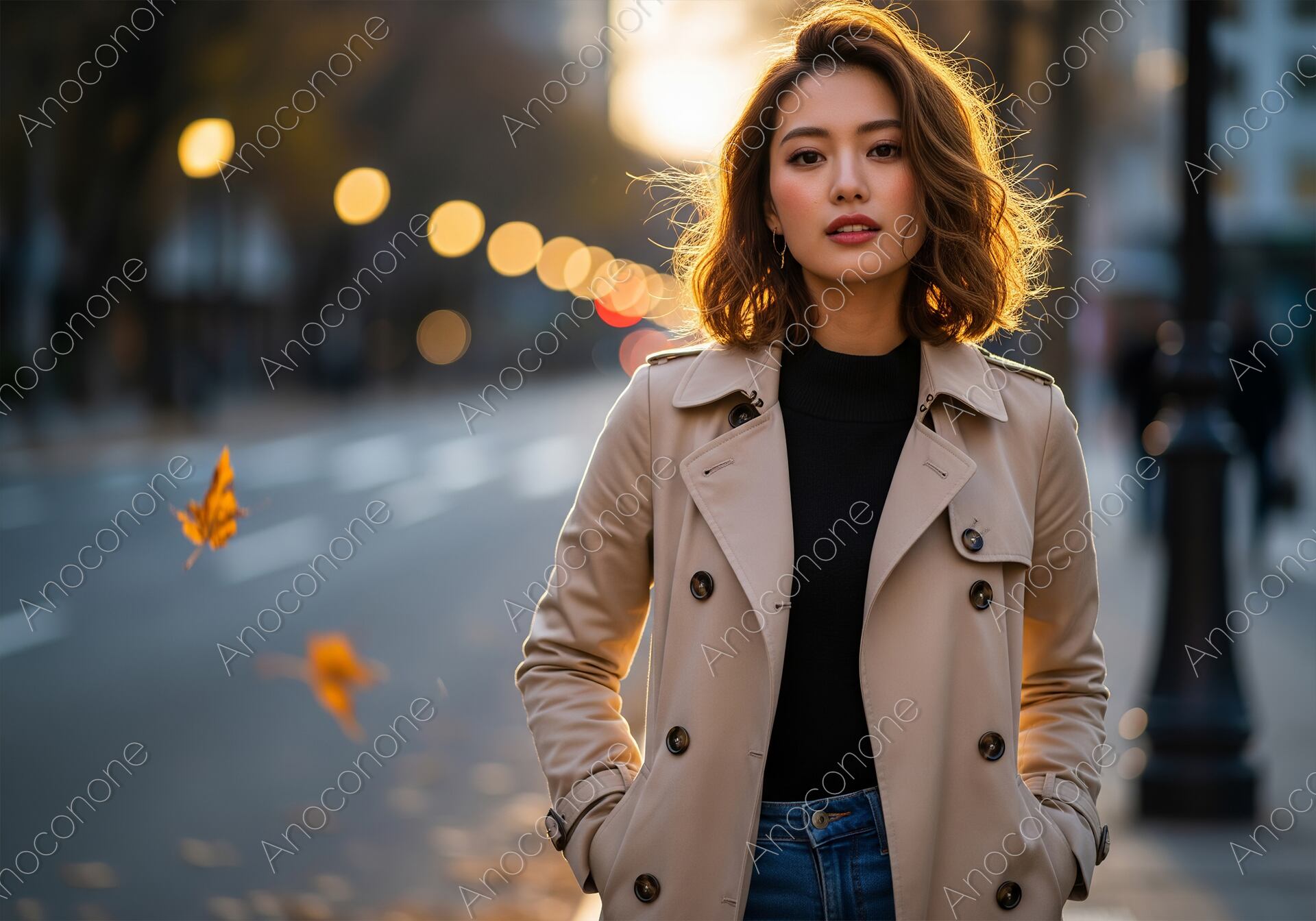 画像素材:都会の夕暮れ時、街路灯が灯り始めた大通りを背景に、スタイリッシュなトレンチコートを着こなす女性を捉えたドラマチックな一枚です。ベージュのトレンチコートに黒のインナー、デニムパンツを合わせた王道の秋コーディネートが、都会的で洗練された印象を与えます。逆光気味に差し込む柔らかな夕日が女性のウェーブヘアを黄金色に縁取り、風に舞う落ち葉が季節の移ろいと情緒的な空気感を演出しています。女性はポケットに手を入れ、落ち着きのある知的な眼差しをこちらに向けており、映画のワンシーンのような物語性を感じさせます。背景の玉ボケした街灯が奥行きを作り出し、被写体の存在感を一層引き立てています。秋のファッション特集や、大人の都会的なライフスタイルを提案する広告・記事のメインビジュアルに最適です。