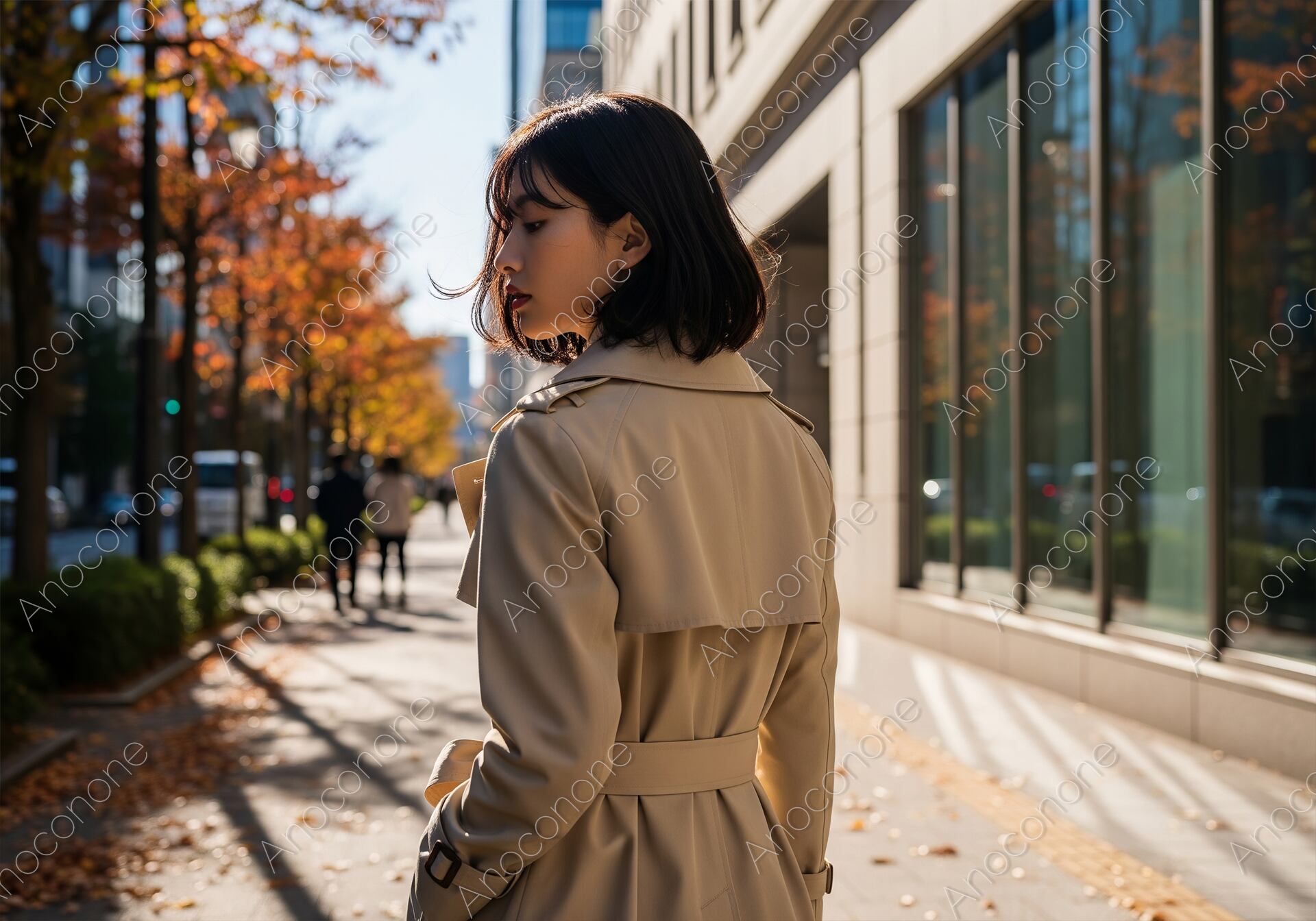 画像素材:都会的なビル群と色鮮やかな街路樹が並ぶ通りで、光と影のコントラストの中に佇む女性の背中越しから横顔を捉えた一枚です。ウエストを絞ったベージュのトレンチコートを美しく着こなし、秋の冷涼な空気を感じさせる洗練されたスタイルを披露しています。女性の視線はどこか遠くを見つめているようで、そのアンニュイな表情と黒髪のボブヘアがミステリアスで知的な雰囲気を醸し出しています。歩道に落ちる長い影や、ビルに反射する柔らかな日差しが、秋の午後の静かな時間を感じさせます。被写体のコートの質感や髪の流れがシャープに描写される一方で、背景の街並みが心地よくぼかされており、都会の喧騒の中にある一瞬の静寂を切り取ったような芸術的な構図です。秋のトレンドファッションのプロモーションや、大人の女性の日常をテーマにした記事のビジュアルとして、強い印象を与える素材です。