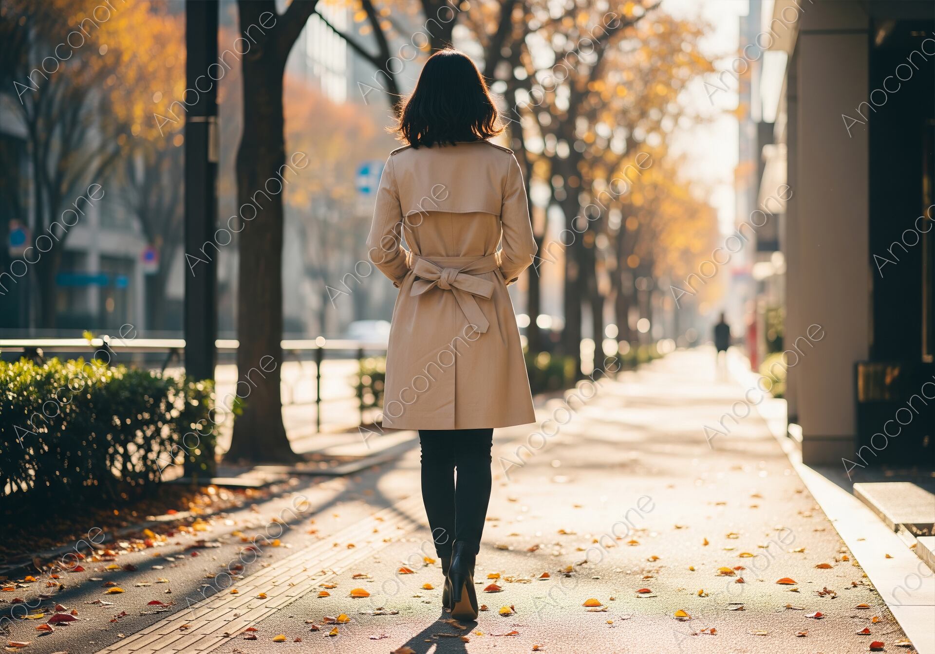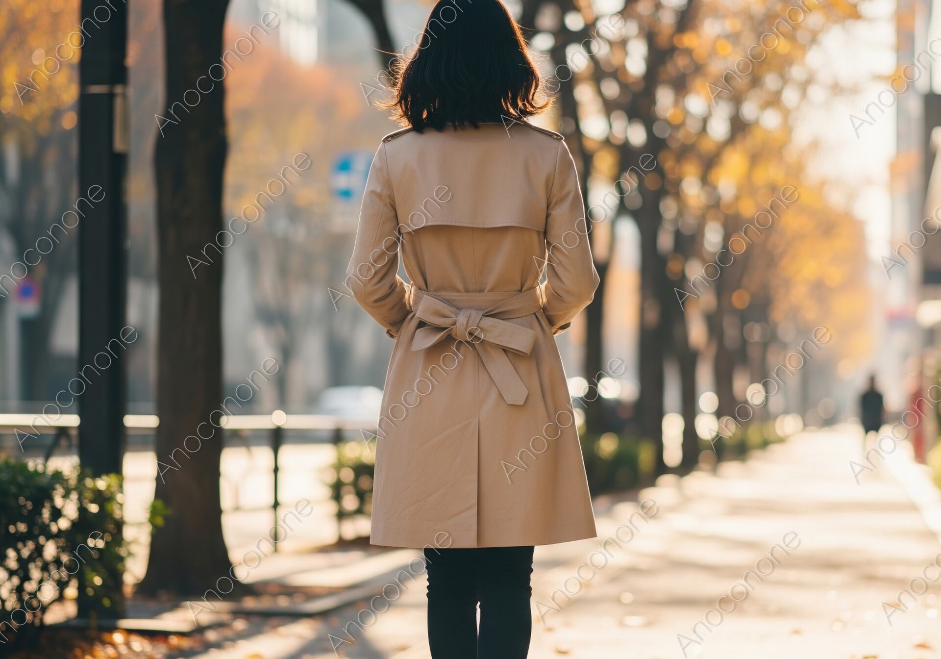 画像素材:黄金色に輝く並木道と柔らかな木漏れ日が美しい都会の歩道を、ベージュのトレンチコートを纏って歩く女性の後ろ姿を捉えた一枚です。ウエストで結ばれたコートのリボンがアクセントとなり、クラシックで洗練された秋の装いを演出しています。黒のスリムなパンツとヒールブーツを合わせたスタイルは、知的で落ち着いた大人の女性の日常を感じさせます。地面に散りばめられた色鮮やかな落ち葉や、街路樹の間から差し込む逆光が、画面全体に温かみとノスタルジックな情緒を添えています。都会の喧騒の中にありながら、静かで穏やかな時間が流れているようなドラマチックな構図です。秋のファッションプロモーション、ライフスタイルを紹介するブログやSNSのメインビジュアル、都会の風景をテーマにしたバナーなど、幅広く活用できる高品質な素材です。