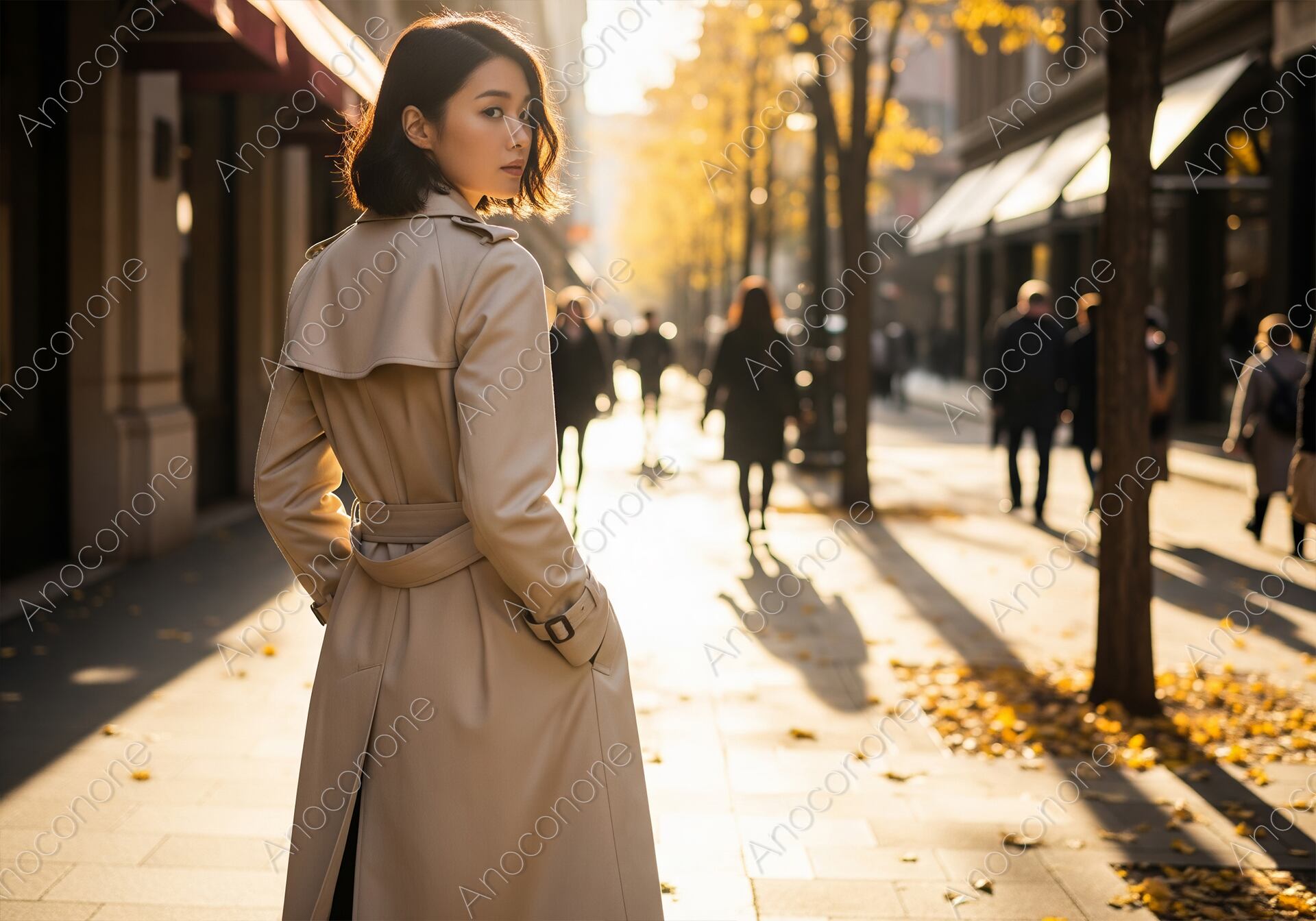画像素材:夕暮れ時の柔らかな日差しが差し込む都会の街並みを背景に、トレンチコートを上品に着こなした女性の印象的な後ろ姿を捉えた一枚です。ベージュのトレンチコートは、ウエストベルトを締めたクラシックなスタイルで、都会的かつ知的な雰囲気を醸し出しています。女性がふと振り返る瞬間を切り取った構図は、見る人を惹きつけるドラマチックな物語性を感じさせます。背景には黄金色に色づいた街路樹や行き交う人々のシルエットが美しくぼけて広がり、秋特有のノスタルジックな空気感を演出しています。長く伸びる影や光のコントラストが、女性のボブヘアの質感やコートの滑らかな生地感を鮮明に際立たせています。都会の秋のファッションを象徴するような、洗練された高品質なポートレート素材です。トレンドの着こなしを紹介する特集や、大人のライフスタイルをテーマにした広告・SNSのメインビジュアルに最適です。