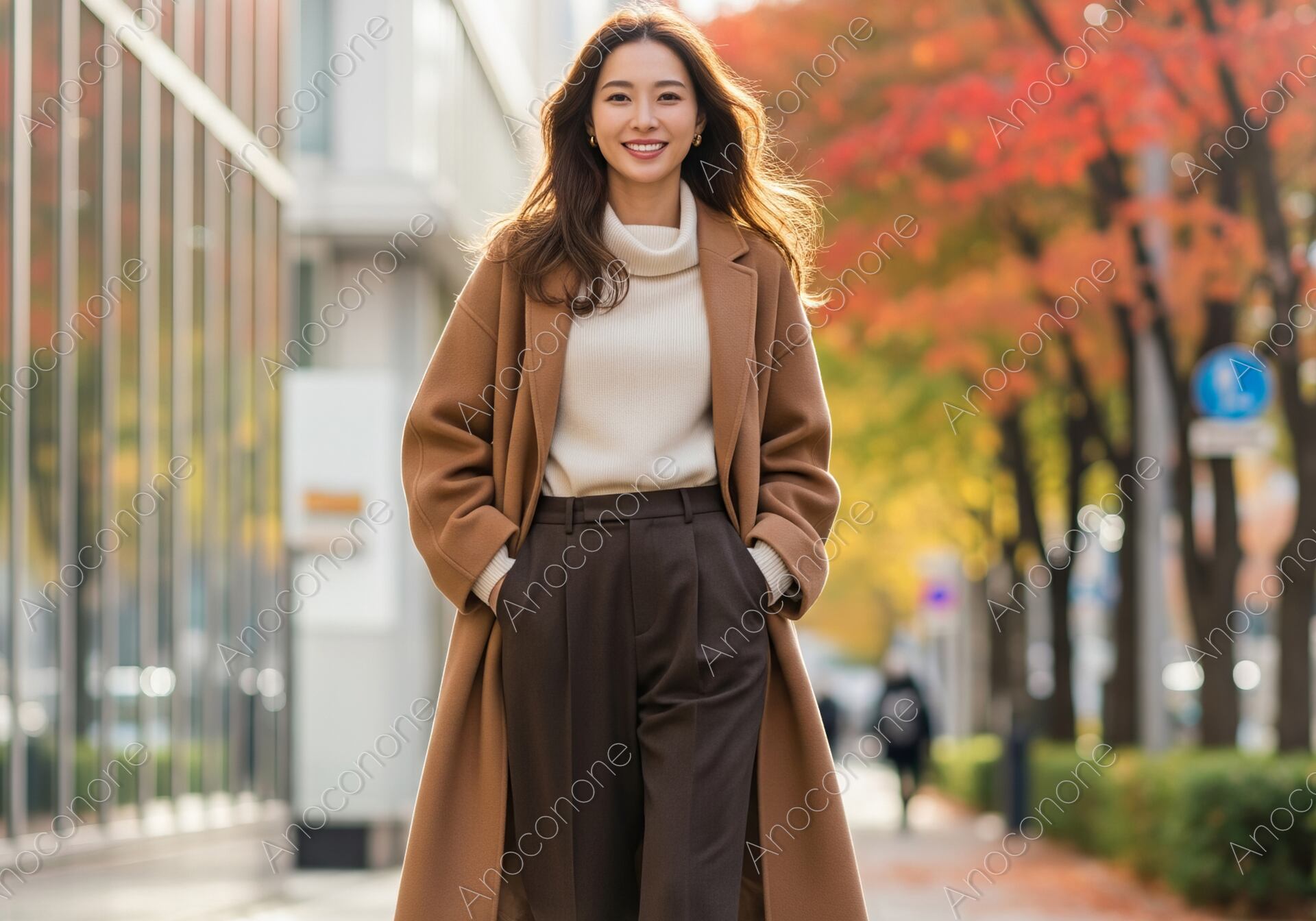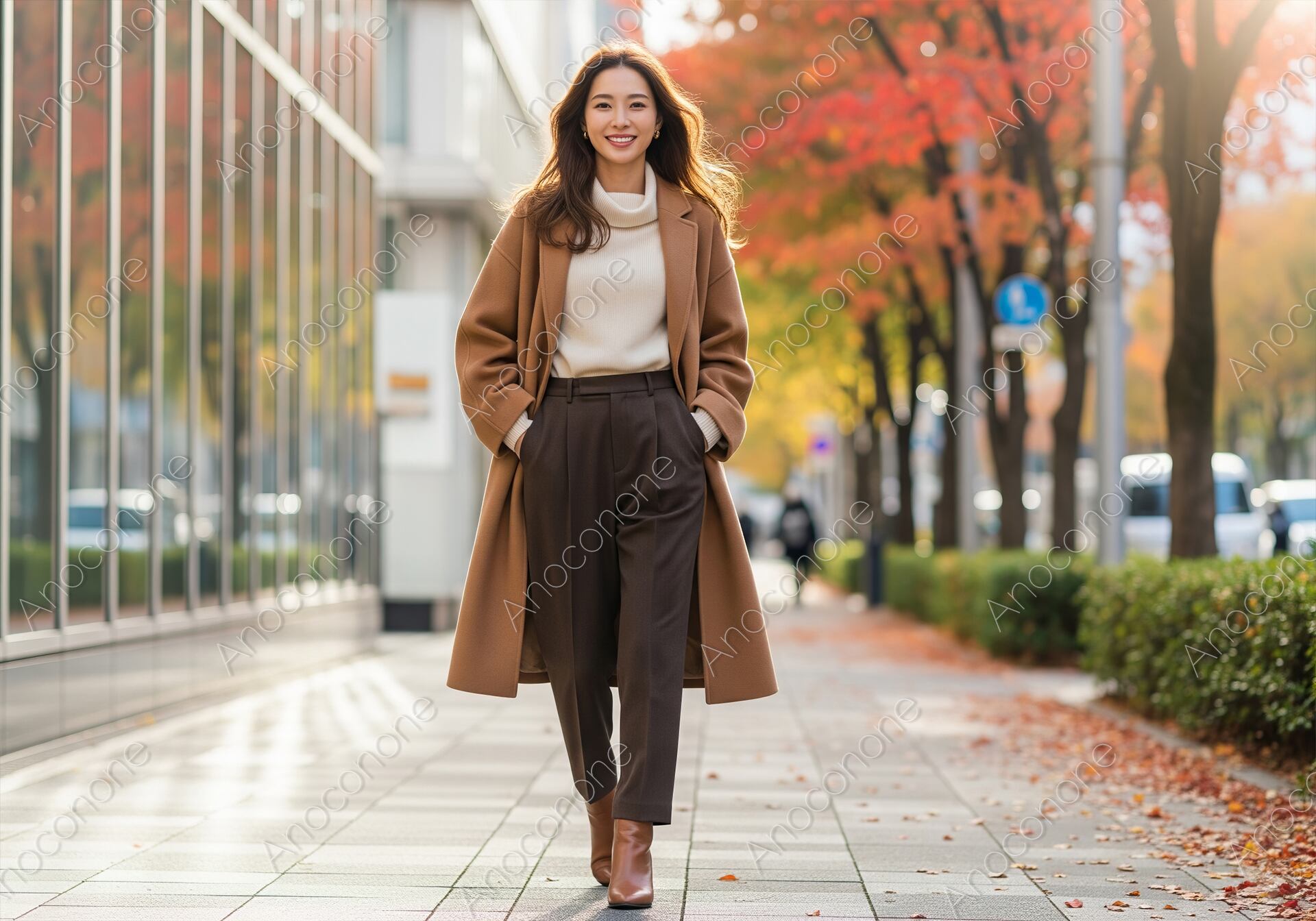 画像素材:色鮮やかに紅葉した街路樹が続く都会の歩道を、颯爽と歩く女性を正面から捉えた一枚です。温かみのあるキャメルのロングコートに、白のタートルネックニット、そしてダークブラウンのセンタープレスパンツを合わせた、上品で洗練された秋のトラッドスタイルが目を引きます。女性は両手をポケットに入れ、晴れやかで自信に満ちた笑顔をこちらに向けており、その明るい表情が周囲の風景をより一層華やかに引き立てています。背景には近代的なビルと秋色に染まった並木道が広がり、都会的なセンスと季節の情緒が絶妙に調和しています。柔らかな自然光が衣装の質感や髪の艶を美しく再現し、奥行きのある構図が被写体の存在感を際立たせています。秋の新作ファッションのプロモーションや、大人の女性の輝く日常をテーマにした広告・Webコンテンツのメインビジュアルに最適な高品質素材です。