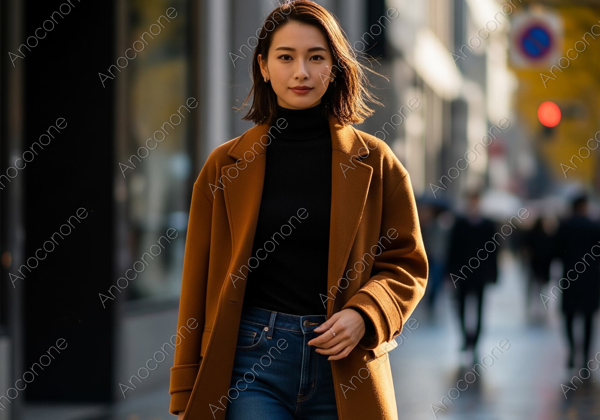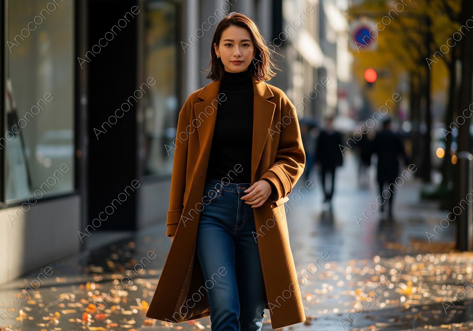 画像素材:落ち葉が舞う都会の舗道を、洗練された秋の装いで颯爽と歩く女性を正面から捉えた一枚です。深みのあるキャメルカラーのロングコートに、黒のタートルネックとタイトなデニムを合わせた、シンプルながらも知的なコントラストが光るコーディネートです。女性は落ち着いた表情で前を見据えており、都会で自立して生きる大人の女性の強さと美しさを感じさせます。背景にはモダンなショップのショーウィンドウや、秋色に染まった街路樹が奥行きをもって広がり、柔らかな逆光が彼女のボブヘアとコートのシルエットをドラマチックに縁取っています。路面に散らばる黄金色の落ち葉が、季節の深まりと情緒的なアクセントを添えています。都会的な秋のファッションプロモーションや、洗練されたライフスタイルを提案する広告・Webサイトのメインビジュアルに最適な、非常に質感の高い素材です。
