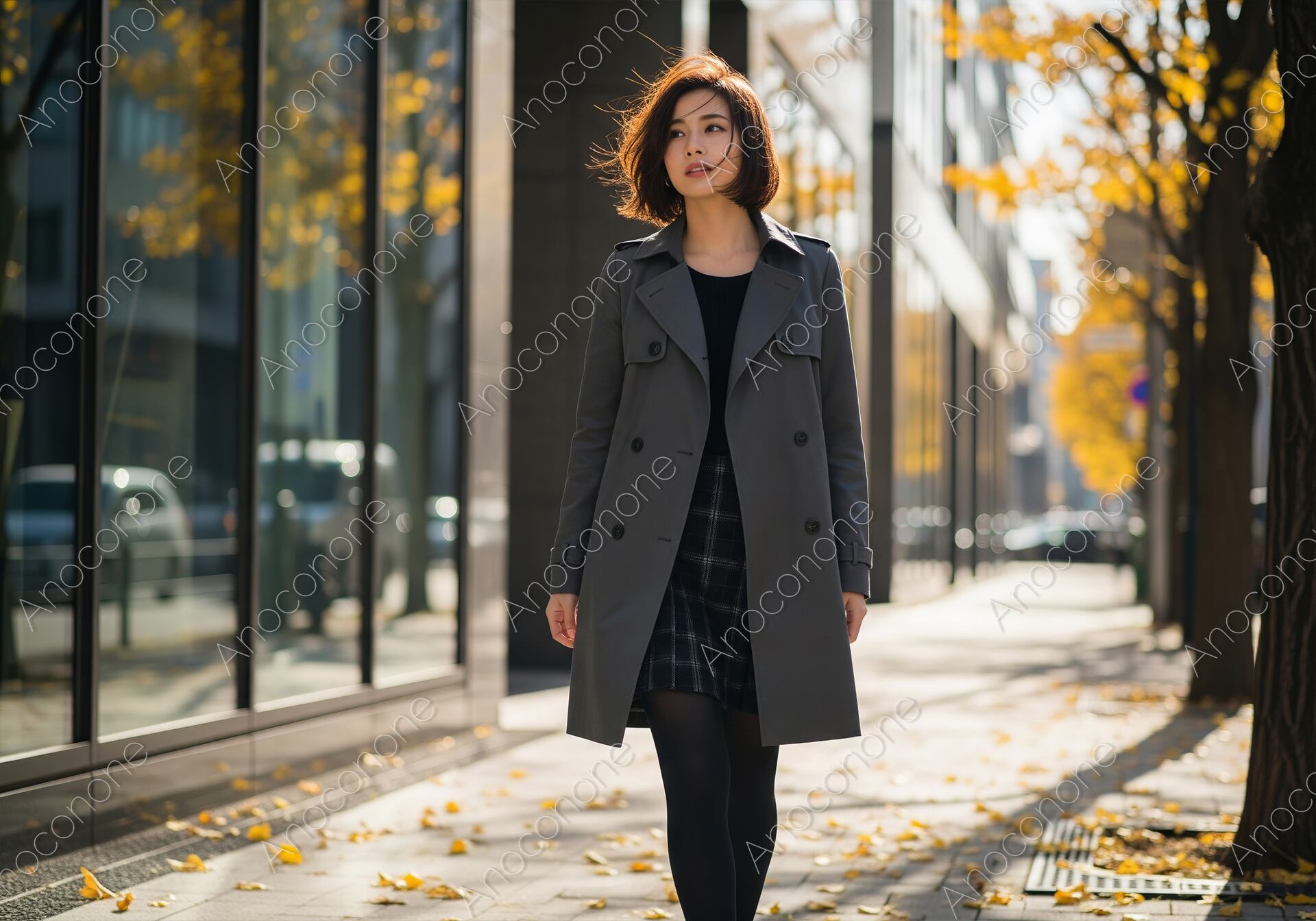 画像素材:黄金色のイチョウが美しく色づく都会のビル街を背景に、スタイリッシュな秋の装いで歩く女性を捉えた一枚です。洗練されたグレーのトレンチコートに、黒のインナーとチェック柄のミニスカート、タイトな黒タイツを合わせた、都会的で知的なコーディネートが印象的です。女性は視線をふと脇に逸らし、凛とした中にも柔らかなアンニュイさを感じさせる表情を浮かべています。風に揺れるボブヘアや、歩道に舞い落ちたイチョウの葉が、季節の移ろいと躍動感を演出しています。背景のガラス張りのビルや街路樹のボケ味が、被写体の存在感を一層引き立て、映画のワンシーンのような高い質感を生み出しています。秋の最新トレンドを紹介するファッション誌や、都会的な大人のライフスタイルを提案する広告・Webサイトのメインビジュアルに最適な高品質素材です。