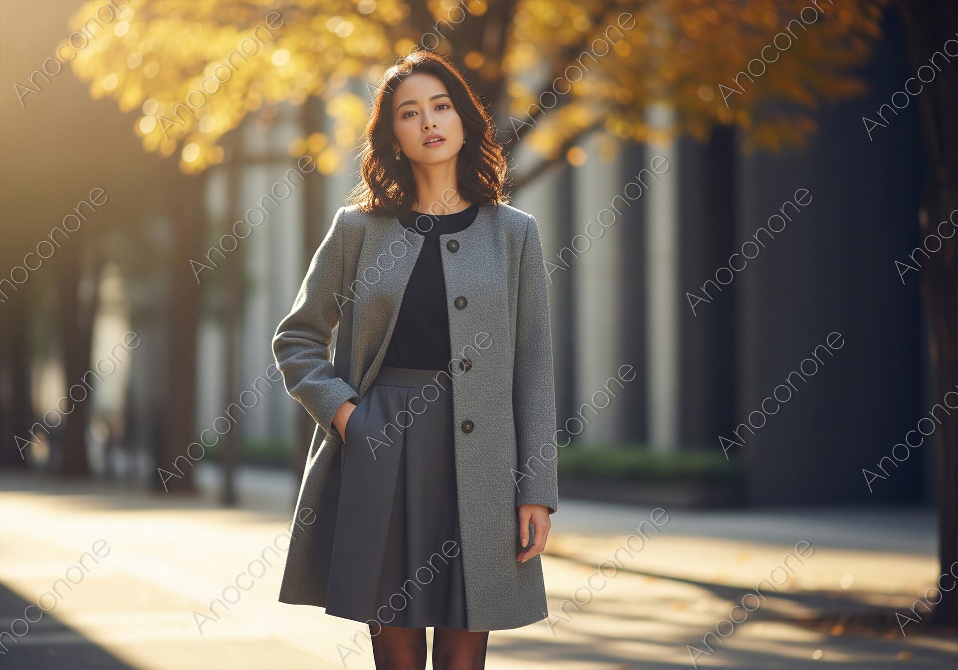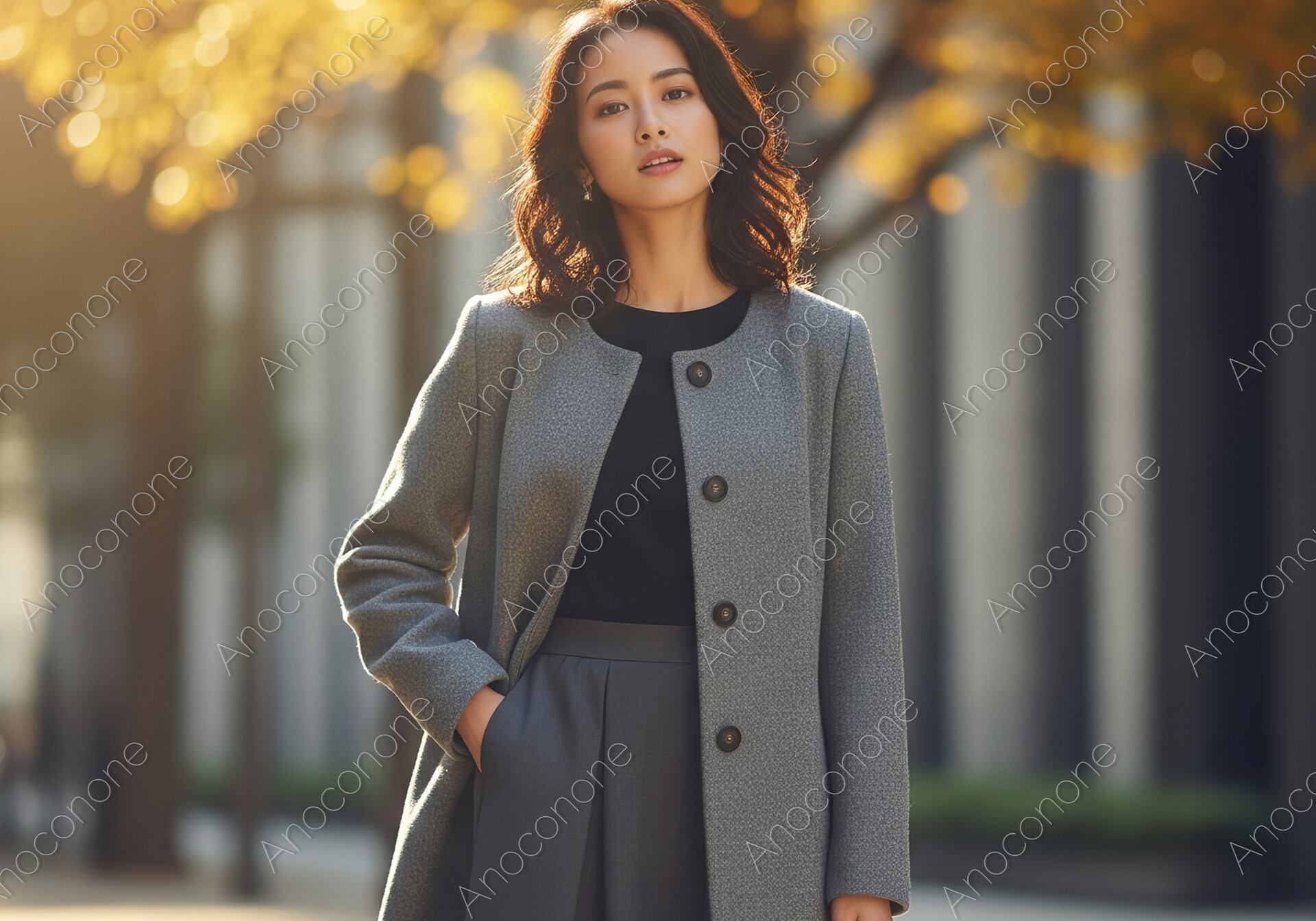 画像素材:黄金色に色づいた街路樹を背景に、柔らかな光の中で静かに佇む女性を捉えたポートレートです。彼女は落ち着いたトーンのグレーのノーカラーコートを身に纏い、インナーには黒のトップスを合わせて、洗練された大人の秋の装いを表現しています。背景にある並木道からは、木の隙間を通った日差しが丸いボケとなって広がり、画面全体を温かく穏やかな空気感で包み込んでいます。女性の穏やかで凛とした表情が、秋の静かな午後の雰囲気と調和しており、都会的な風景の中に自然な美しさが際立つ構成です。髪のウェーブや衣服の質感が繊細に描写され、季節感あふれる上品な一枚に仕上がっています。秋のファッション誌や、落ち着いたライフスタイルを紹介する媒体に役立ちます。
