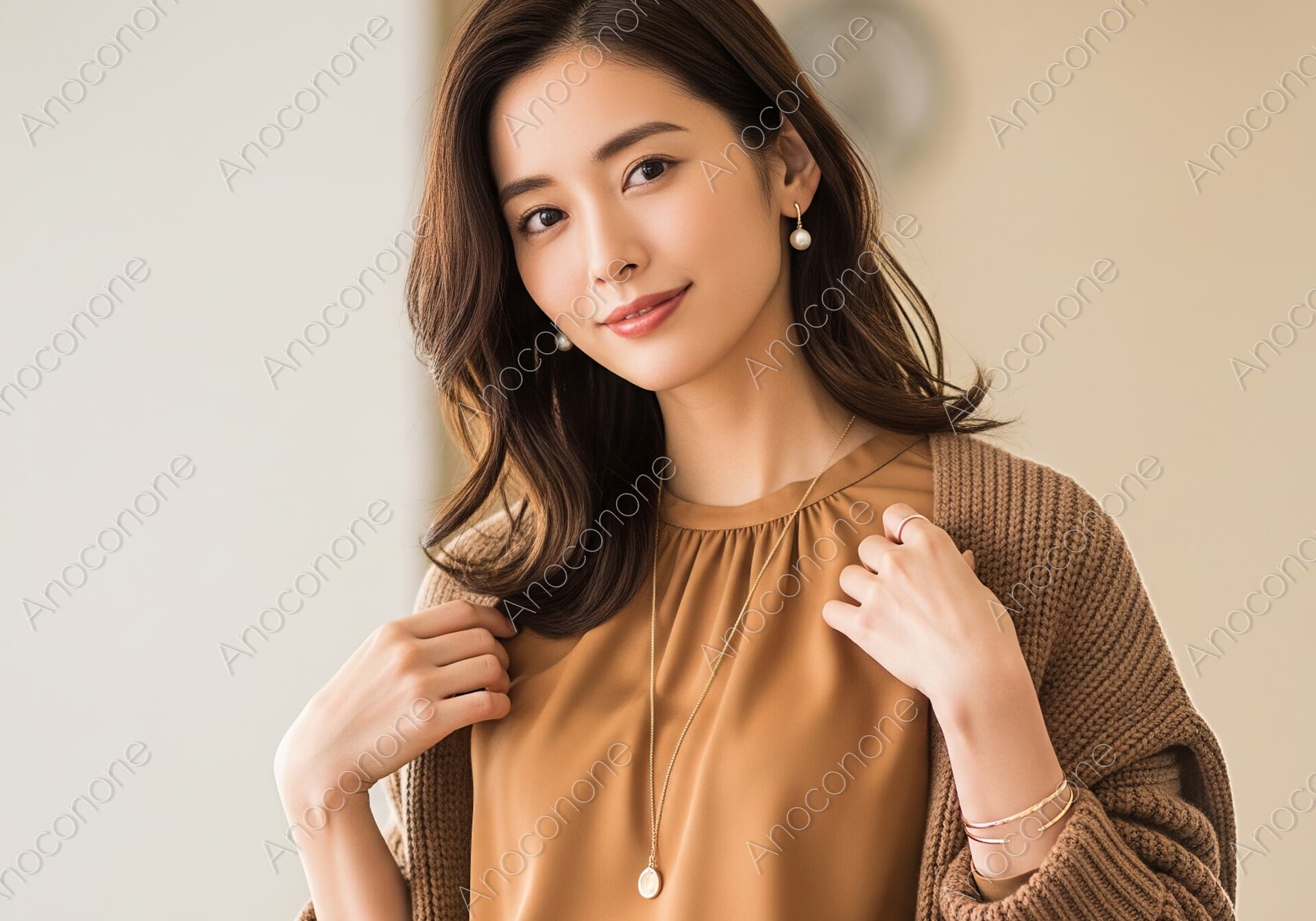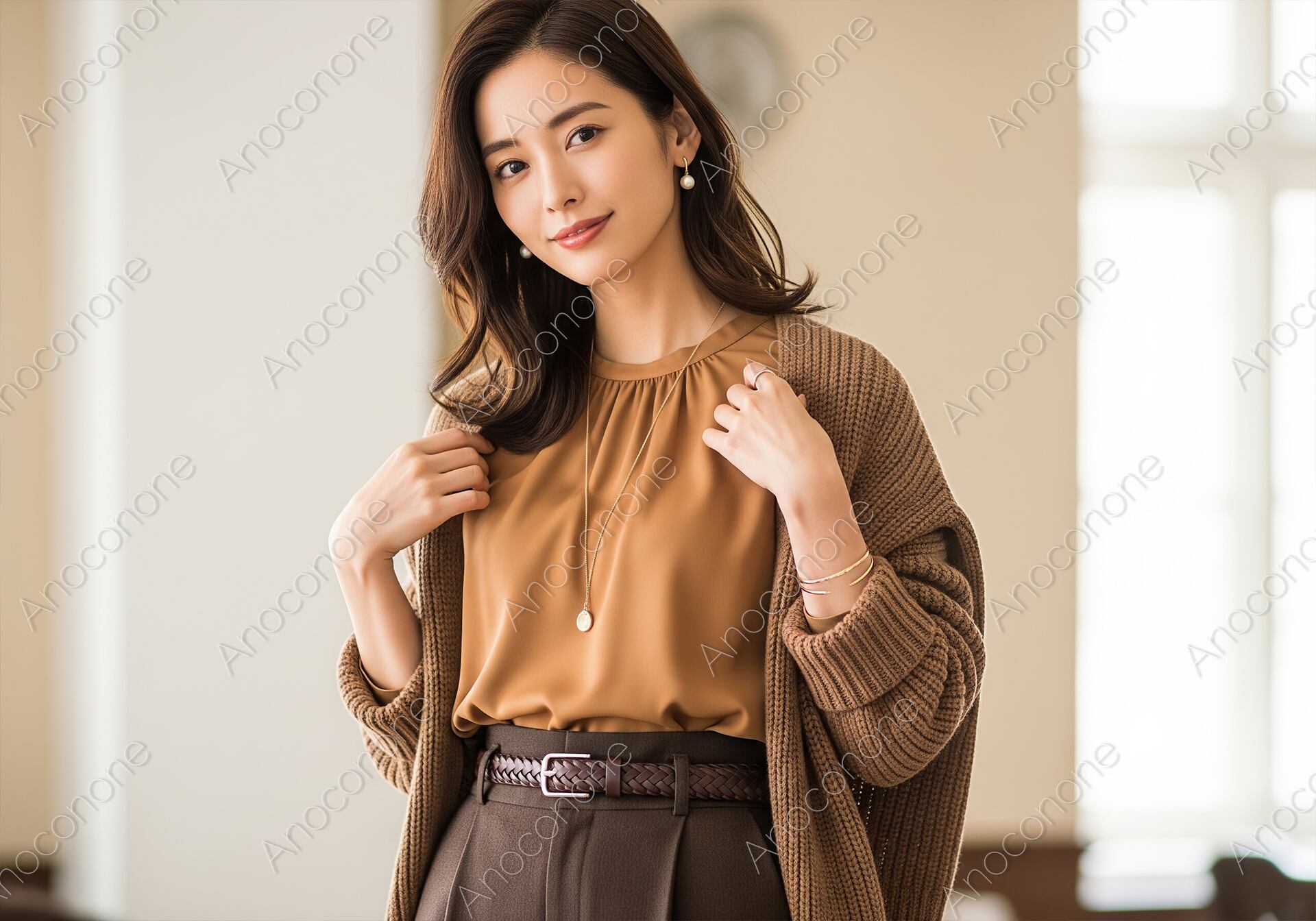 画像素材:温かみのあるブラウンのざっくりとしたニットカーディガンを羽織り、優雅な微笑みを浮かべる女性を正面から捉えた一枚です。インナーには光沢感のあるキャメル色のブラウスを合わせ、ボトムスには編み込みベルトがアクセントのダークブラウンのパンツを選択しています。全体を同系色のグラデーションでまとめることで、秋らしい深みと洗練された大人の落ち着きを表現しています。耳元で揺れるパールのイヤリングと、胸元に輝くシンプルなゴールドのネックレスが、コーディネートに品格を添えています。背景は柔らかな光が回る明るい室内となっており、被写体の肌の質感や衣服の柔らかな風合いが、自然かつ繊細に描写されています。季節の変わり目を感じさせる装いと、包み込むような優しさが印象的な構図です。秋のトレンドファッションを紹介する記事や、大人の女性向けのライフスタイル提案に役立ちます。