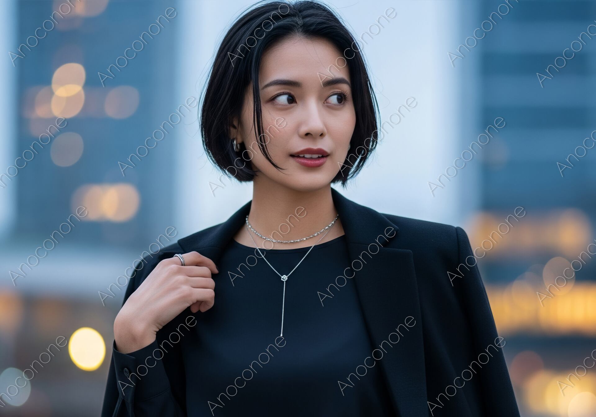 画像素材:暮れなずむ都会の夜景を背景に、洗練されたブラックコーディネートに身を包んだ女性を捉えた一枚です。彼女は質感の異なる黒のブラウスとパンツを組み合わせ、肩にはテーラードジャケットを無造作に羽織ることで、都会的で自立した女性の強さを表現しています。首元には繊細なシルバーのネックレスを重ね付けし、手元にはレザーのクラッチバッグを持つことで、ダークトーンの装いに華やかさと奥行きを与えています。背景には高層ビルの明かりが柔らかな玉ボケとなって広がり、静寂な夜の空気感と都会の躍動感が絶妙に混ざり合っています。彼女の短く切りそろえられたボブヘアと、どこか遠くを見つめるクールな眼差しが、スタイリッシュな雰囲気をより一層引き立てています。夜のファッションシーンや、都会的なライフスタイルを提案する広告、SNSのメインビジュアルとして適しています。