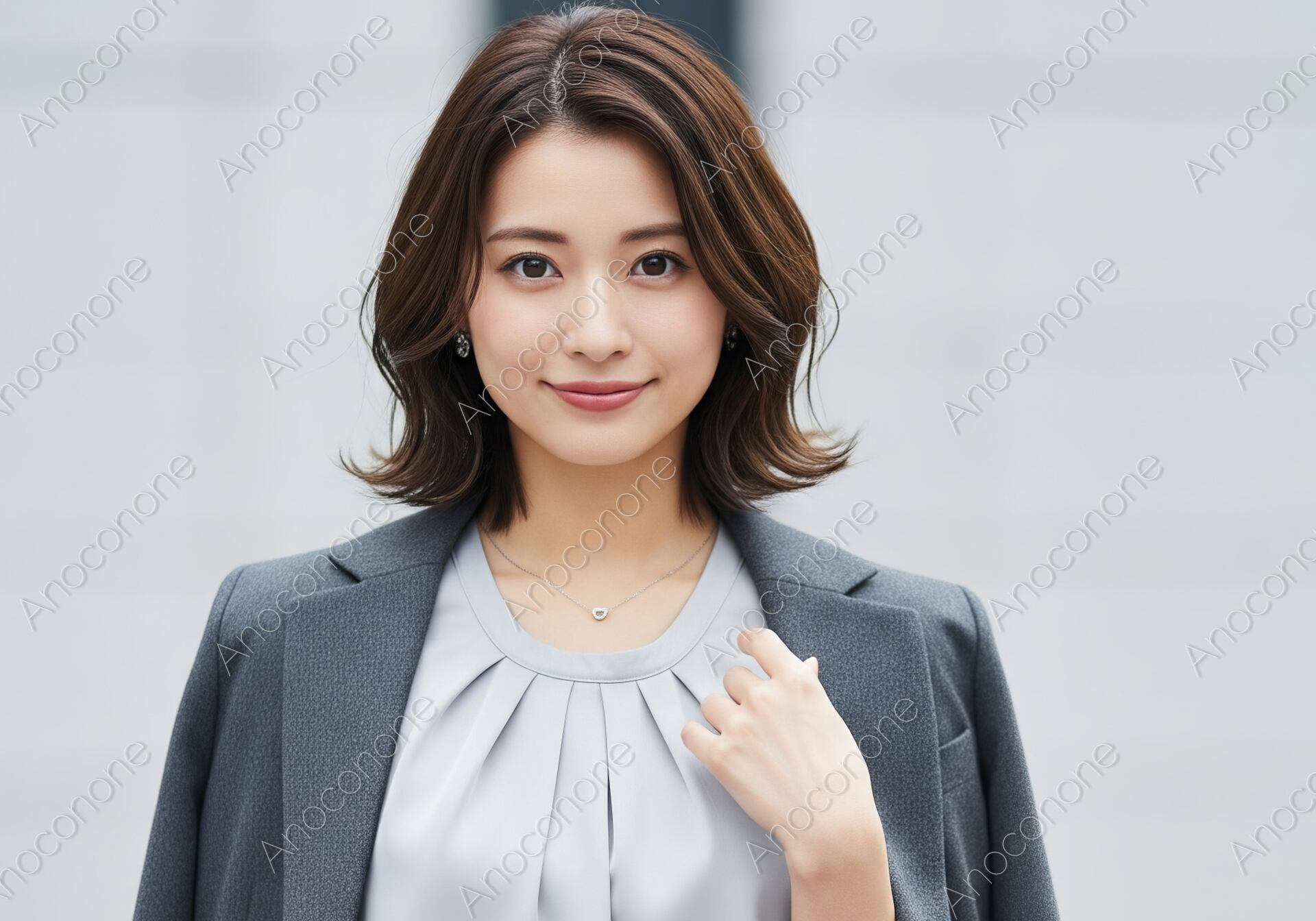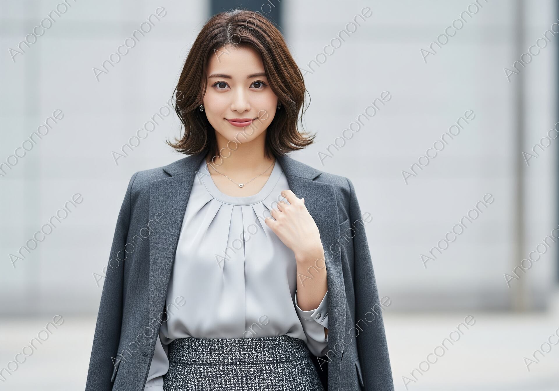 画像素材:都会の洗練されたオフィス街を背景に、凛とした佇まいでこちらを見つめる女性のポートレートです。彼女は光沢感のある上品なライトグレーのブラウスに、同系色のテーラードジャケットを無造作に肩掛けしており、プロフェッショナルな中にもこなれ感のあるスタイルを表現しています。ボトムスには細かな織り模様が美しいツイード調のスカートを合わせ、全身をグレーのグラデーションで統一することで、知的で落ち着いた大人の女性像を作り出しています。首元に光るシンプルな一粒ネックレスが、顔周りにさりげない華やかさを添えています。背景をシンプルにぼかすことで、彼女の整ったヘアスタイルと穏やかな表情、そして衣服の繊細な質感がより一層際立つ構図となっています。清潔感と信頼感を感じさせるこの一枚は、ビジネス誌の特集や働く女性をターゲットにしたライフスタイルメディアの素材として適しています。