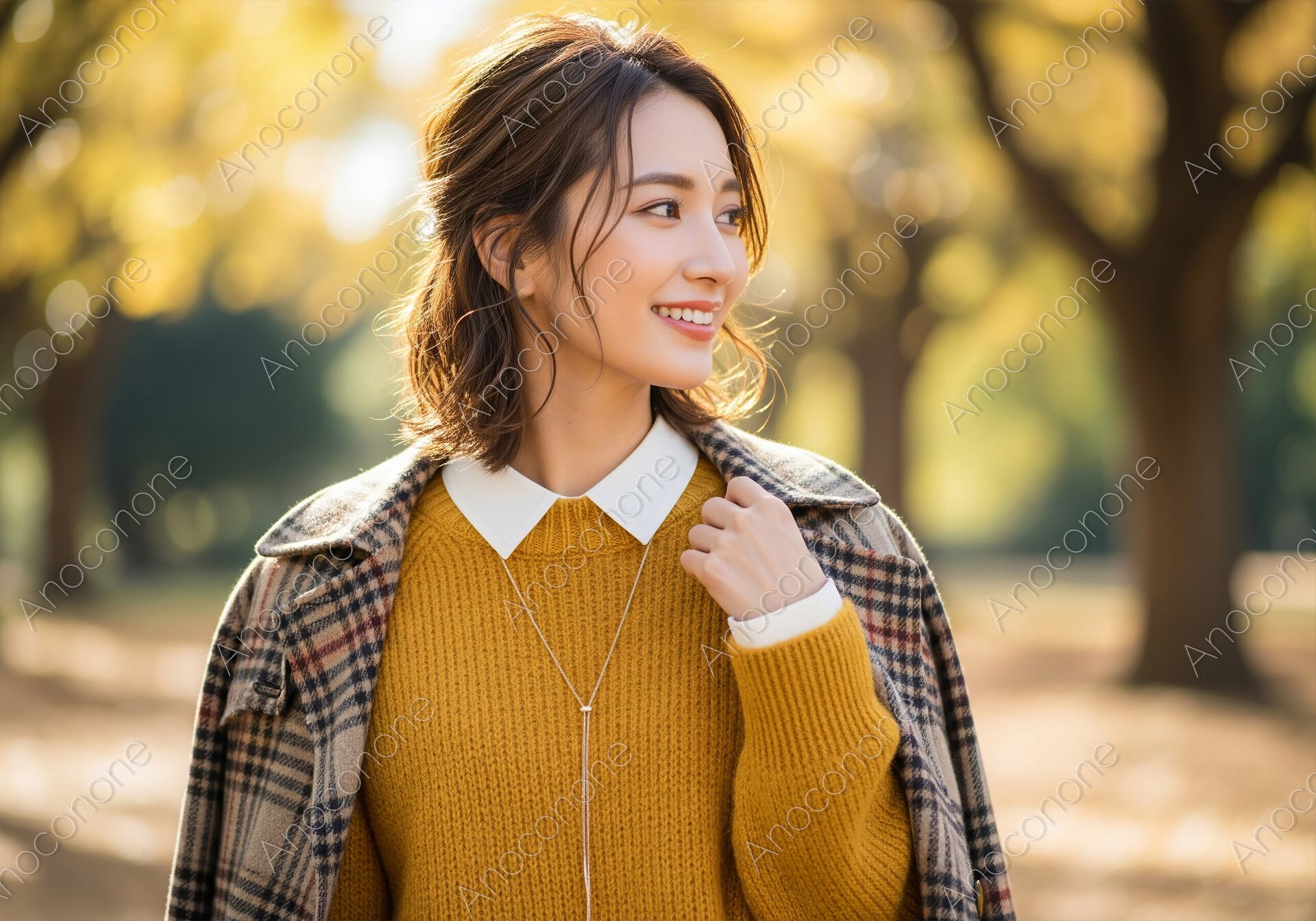 画像素材:黄金色に輝く銀杏並木を背景に、柔らかな秋の日差しを浴びて微笑む女性の横顔を捉えたポートレートです。彼女は鮮やかなマスタードイエローのクルーネックニットに、清潔感のある白いシャツをレイヤードし、知的な印象を与える秋の装いを披露しています。肩には落ち着いたベージュを基調としたチェック柄のコートを無造作に羽織り、リラックスした中にも都会的な洗練さを感じさせるコーディネートを完成させています。背景の木々は温かみのある光に包まれ、美しい玉ボケとなって彼女の自然な表情と繊細にまとめられたヘアスタイルを優しく引き立てています。胸元で揺れるシンプルなロングネックレスが、カジュアルなスタイルにさりげない気品を添えている一枚です。季節の移ろいを感じさせる温かな空気感と、彼女の明るい笑顔が調和した魅力的な構図となっています。秋のお出かけやファッション特集、ライフスタイルを提案するブログのアイキャッチに最適です。