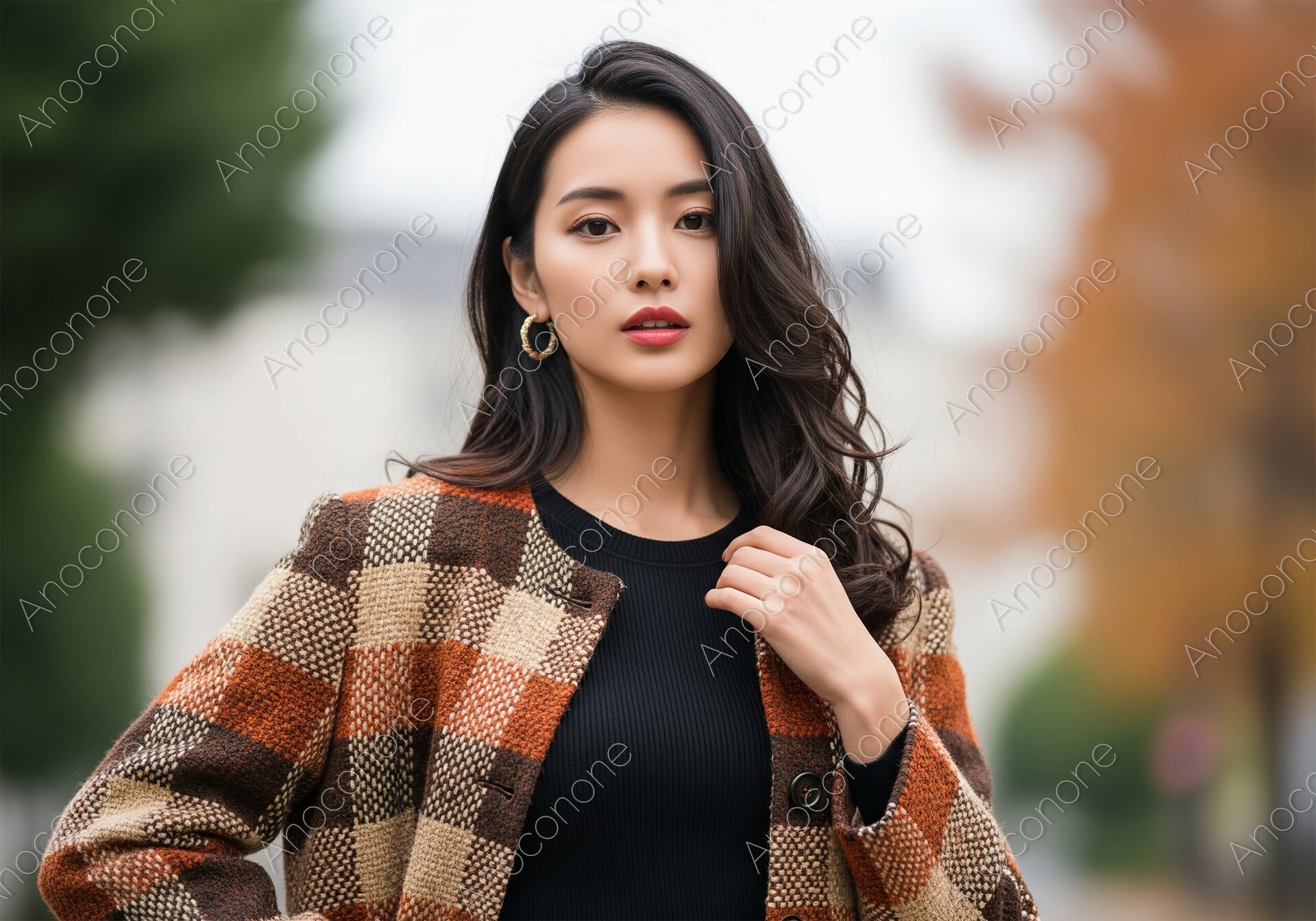 画像素材:オレンジやブラウン、ベージュを組み合わせた大柄のチェックジャケットを主役にした、秋らしい温かみのあるコーディネートを纏う女性のポートレートです。インナーにはシンプルな黒のリブニットを合わせることで、ジャケットの華やかな模様を際立たせ、全体の印象を引き締めています。彼女の流れるようなウェーブヘアと、意志の強さを感じさせる落ち着いた眼差しが、都会的で洗練された雰囲気を醸し出しています。耳元には存在感のあるゴールドのフープピアスが輝き、顔周りにリッチなアクセントを添えています。背景には秋の色に染まり始めた木々が柔らかなボケ味とともに写り込み、被写体の存在感をより一層高めています。季節感のある色使いと丁寧なライティングにより、衣服の質感まで細やかに描写された質の高い一枚です。秋のトレンドファッションを紹介するカタログや、都会的なライフスタイルをテーマにしたメディアに最適です。