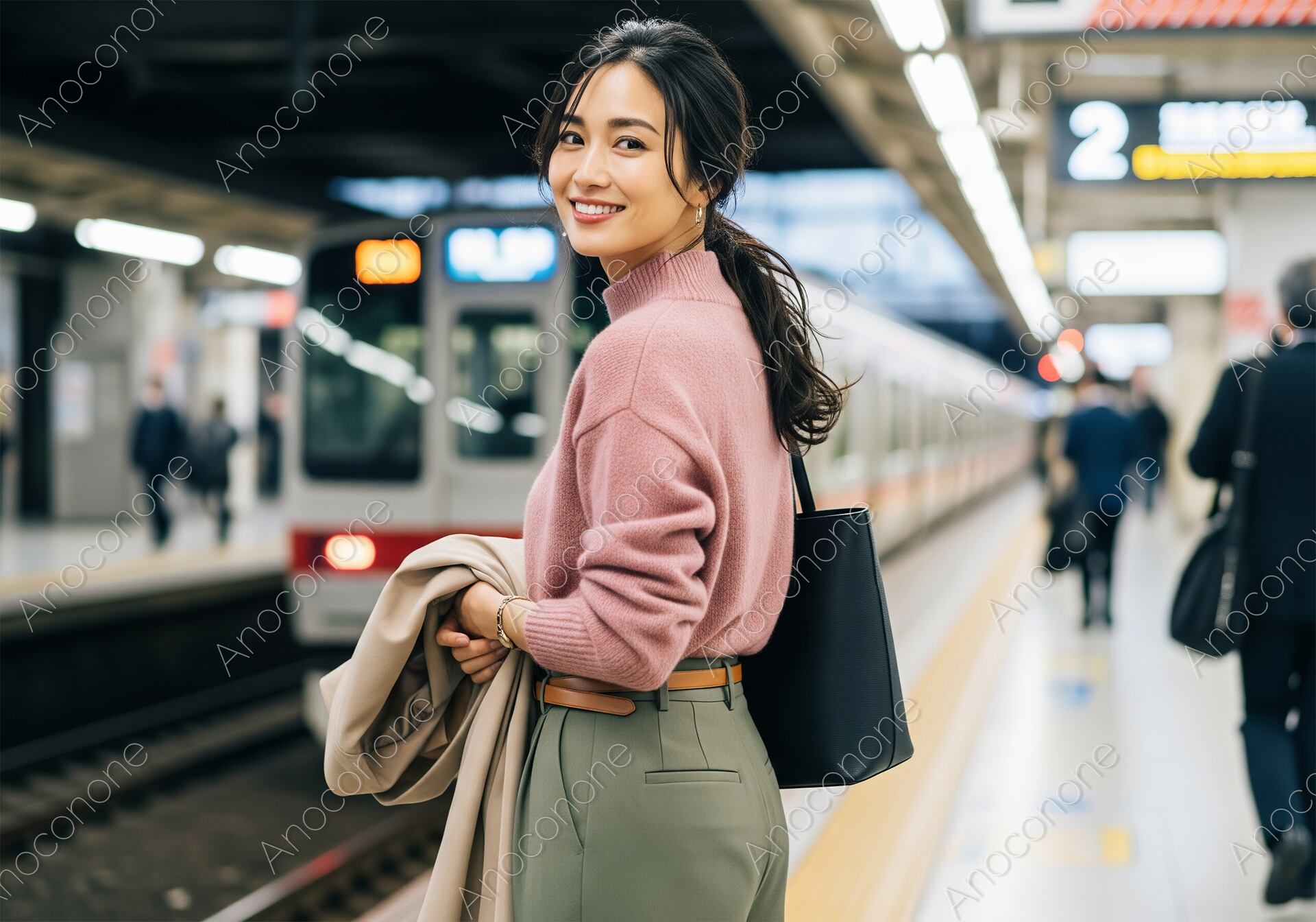 都会の駅で電車を待つ、洗練された大人の女性を捉えた一枚。柔らかなピンクのタートルネックニットにカーキのパンツ、手にはベージュのコートを持ち、秋らしいコーディネートが魅力的です。自然な笑顔で振り返る表情は好印象で、ポジティブで活動的なイメージを演出します。通勤、ビジネス、ライフスタイル、秋のファッションなど、多様なテーマでご活用いただける高クオリティな素材です。