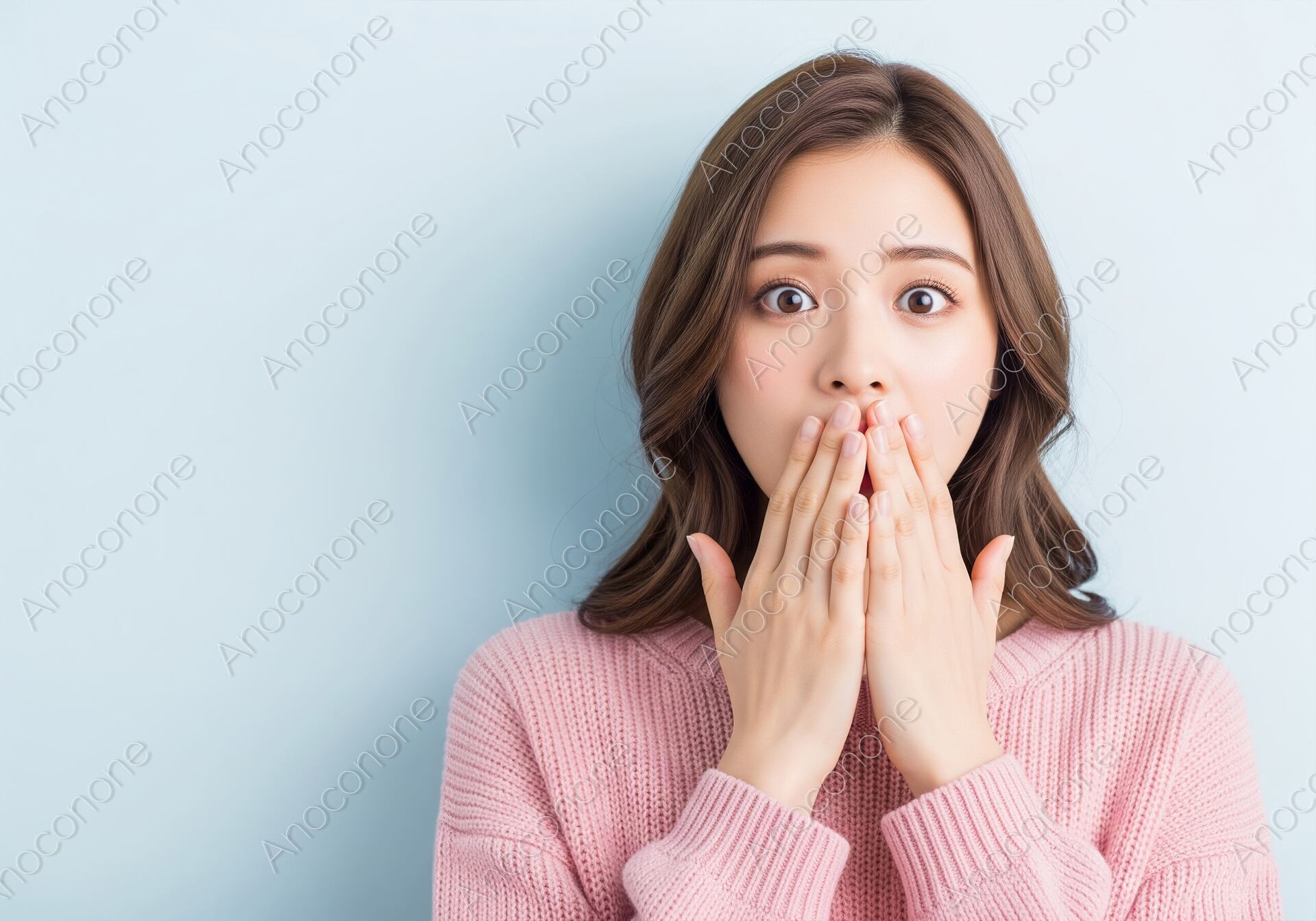 ピンクのニットを着た女性が、両手で口元を覆い驚きを表現しているポートレートです。大きく見開いた目が、驚きやショック、困惑といった感情を伝えています。シンプルな背景とモデルの豊かな表情が際立ち、見る人に強いインパクトを与えます。感情、発見、感動、インスピレーションなど、幅広いテーマでご活用いただける高クオリティな素材です。