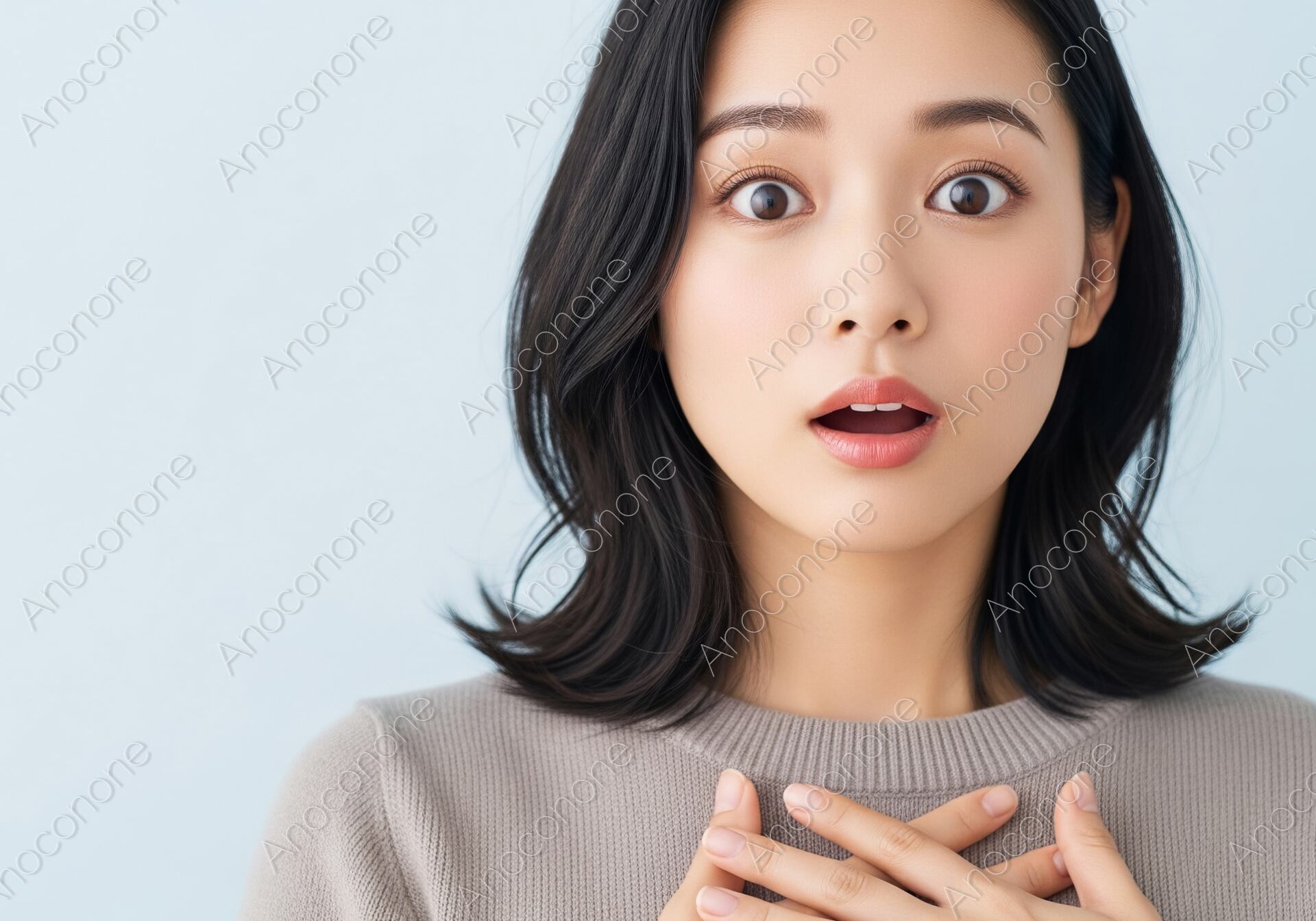 ミディアムボブヘアの女性が、胸に手を当て驚きを表現しているポートレートです。大きく見開いた目と開いた口が、驚きやショックといった感情をストレートに伝えています。画面左側の広い余白は、テキストやロゴを配置するのに最適です。感情、発見、感動、インスピレーションなど、幅広いテーマでご活用いただける高クオリティな素材です。