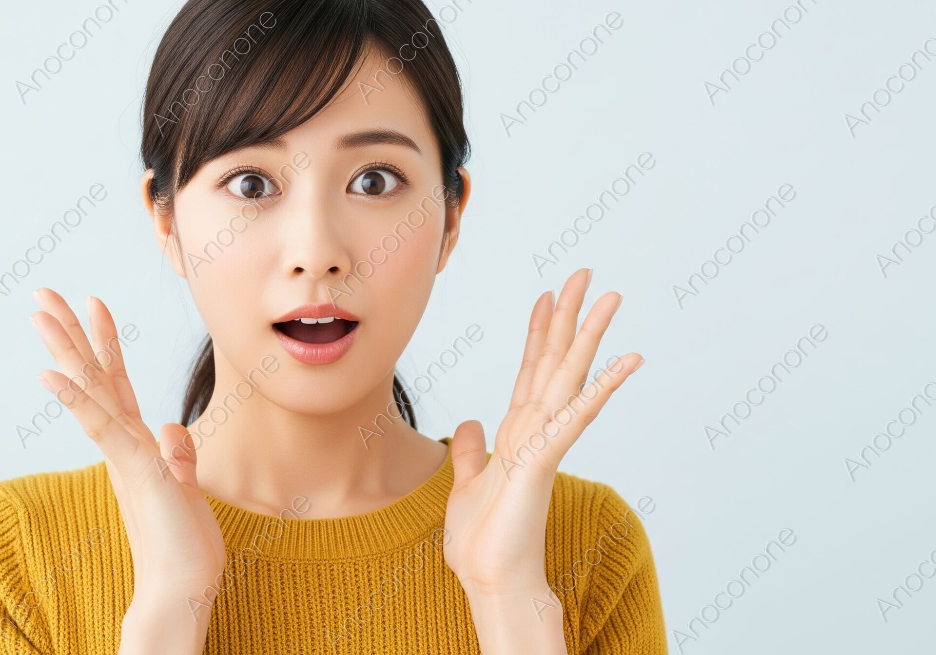 イエローのタートルネックニットを着た女性が、両手を広げ驚きを表現しているポートレートです。大きく見開いた目と開いた口が、驚きやショックといった感情をストレートに伝えています。画面右側の広い余白は、テキストやロゴを配置するのに最適です。感情、発見、感動、インスピレーションなど、幅広いテーマでご活用いただける高クオリティな素材です。