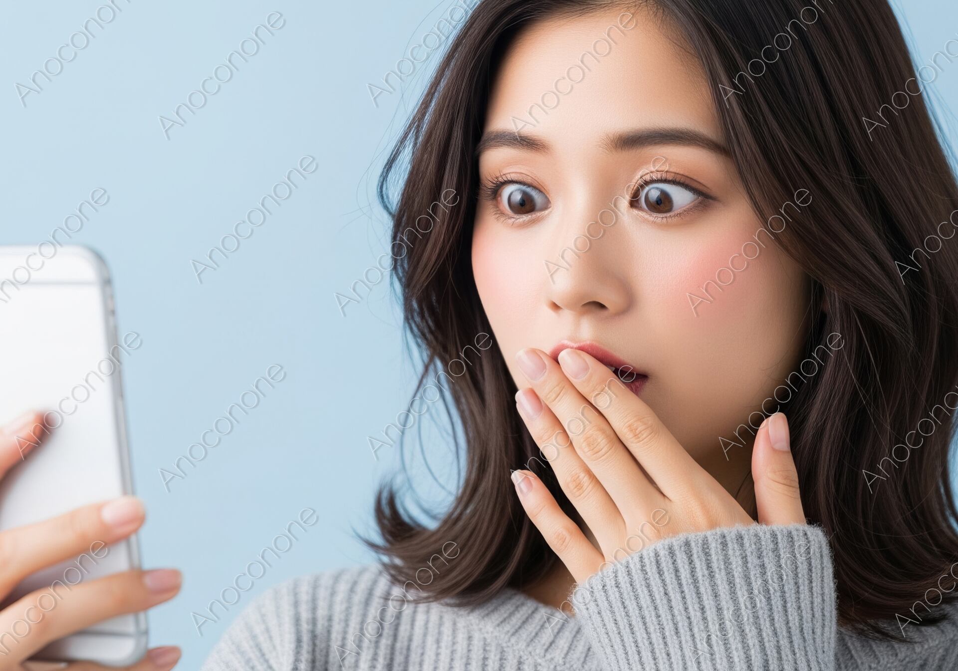 グレーのニットを着た女性が、スマートフォン画面を見て驚きを表現しているポートレートです。大きく見開いた目と口元に当てられた手が、驚きやショックといった感情をストレートに伝えています。感情、発見、感動、インスピレーションなど、幅広いテーマでご活用いただける高クオリティな素材です。