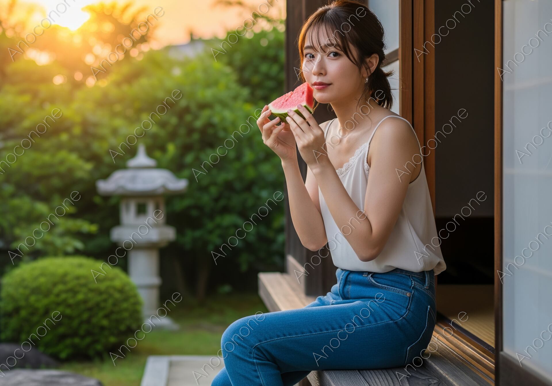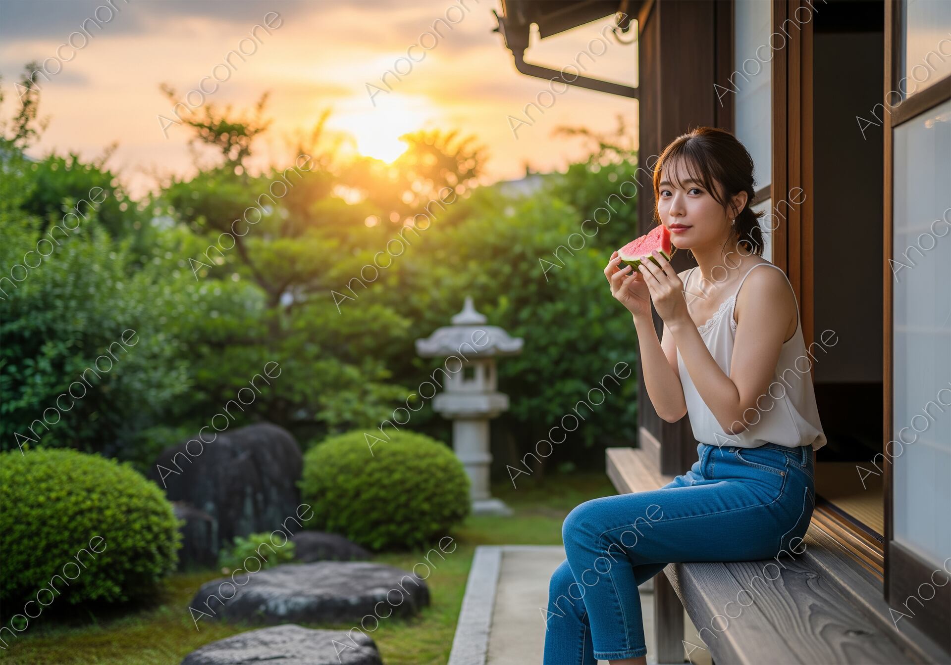 夏の夕暮れ時、縁側でスイカを食べる女性を捉えた美しい情景です。白いキャミソールにデニムパンツという爽やかな服装が、夏の雰囲気と合わさって魅力的な一枚です。温かい光に包まれた柔らかな表情と、風情ある日本庭園の組み合わせが、心安らぐ時間と情緒を演出します。夏、リラックス、日本の文化、ライフスタイルなど、幅広いテーマでご活用いただけます。