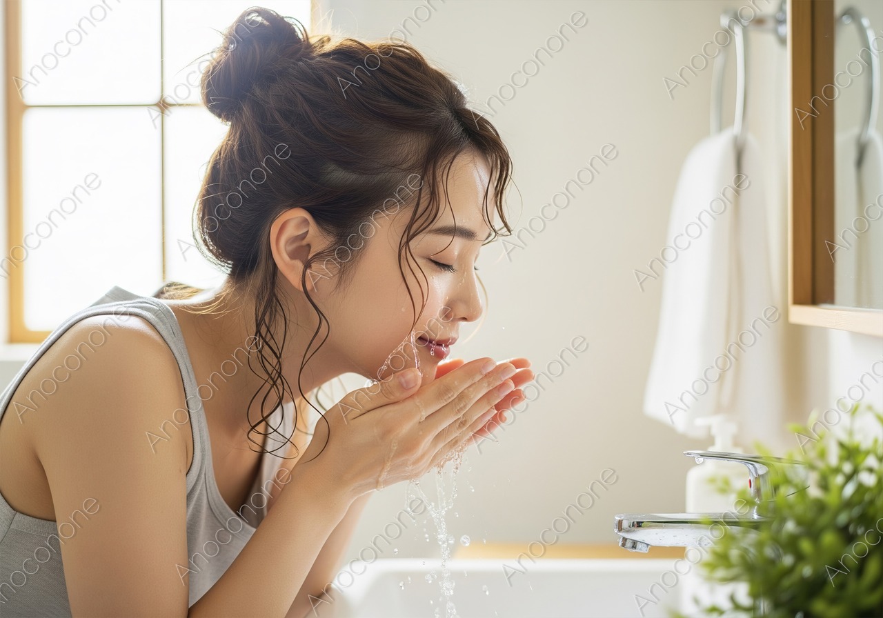 洗面所で洗顔をする女性を捉えた一枚です。顔に落ちる水滴と、両手で水を掬う様子が、みずみずしさと清潔感を演出しています。目を閉じて洗顔をする表情は、リラックスした心地よい時間を表現しています。朝の洗顔や、夜のスキンケアのルーティンを表現するのに最適な写真です。美容、スキンケア、ヘルスケアなど、幅広いテーマでご活用いただけます。