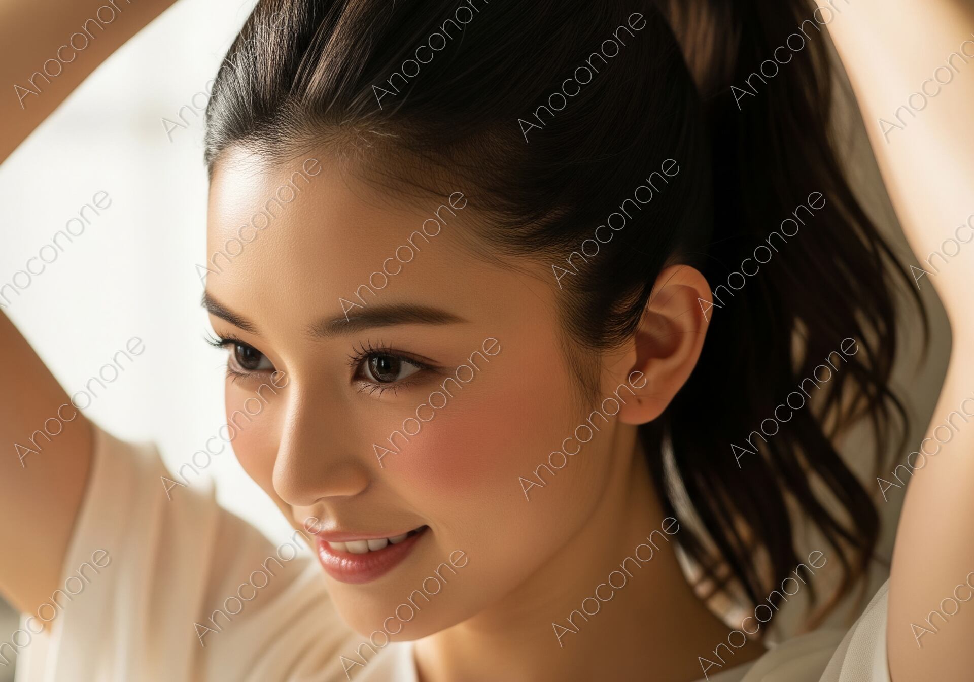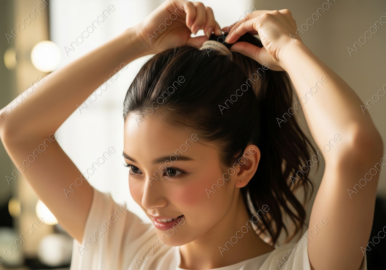 白いトップスを着た女性が、髪をポニーテールにまとめる瞬間にフォーカスした一枚です。両手で髪を束ね、鏡に映る自分を見つめながら微笑む表情が、これからお出かけする楽しさを表現しています。軽やかで清潔感のある印象を与え、美容、ファッション、ヘアケアなど、幅広いテーマでご活用いただける高クオリティな素材です。