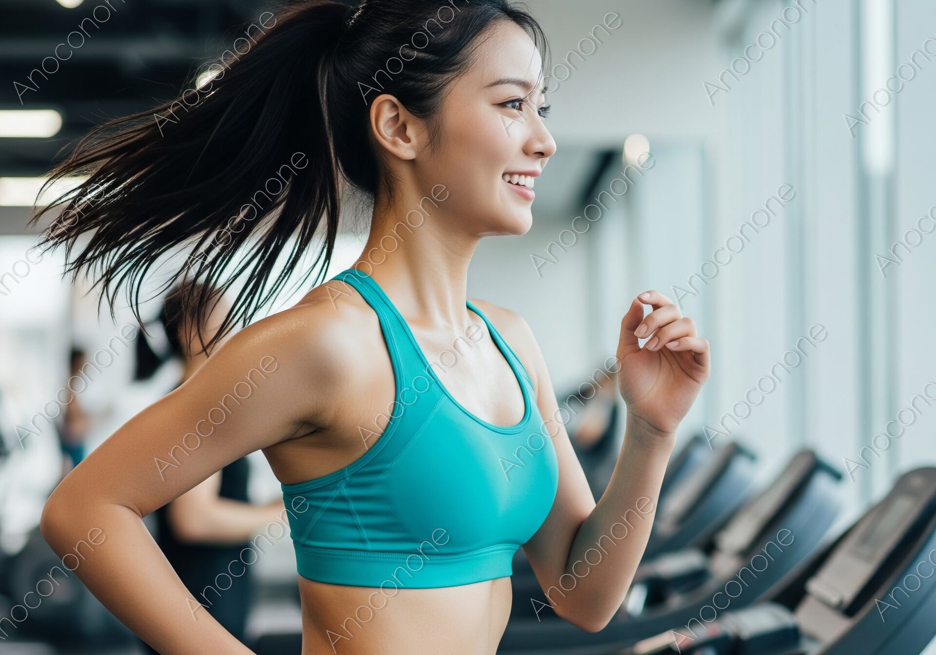 清潔感のあるジムで、ランニングマシンを走る女性を捉えた一枚です。ターコイズブルーのスポーツブラと黒いパンツというヘルシーなスポーツウェアが、健康的で爽やかな印象を与えます。汗をかきながらも笑顔で走る姿は、運動を楽しむポジティブな姿勢を表現しています。ジム、トレーニング、健康、ライフスタイルなど、幅広いテーマでご活用いただけます。